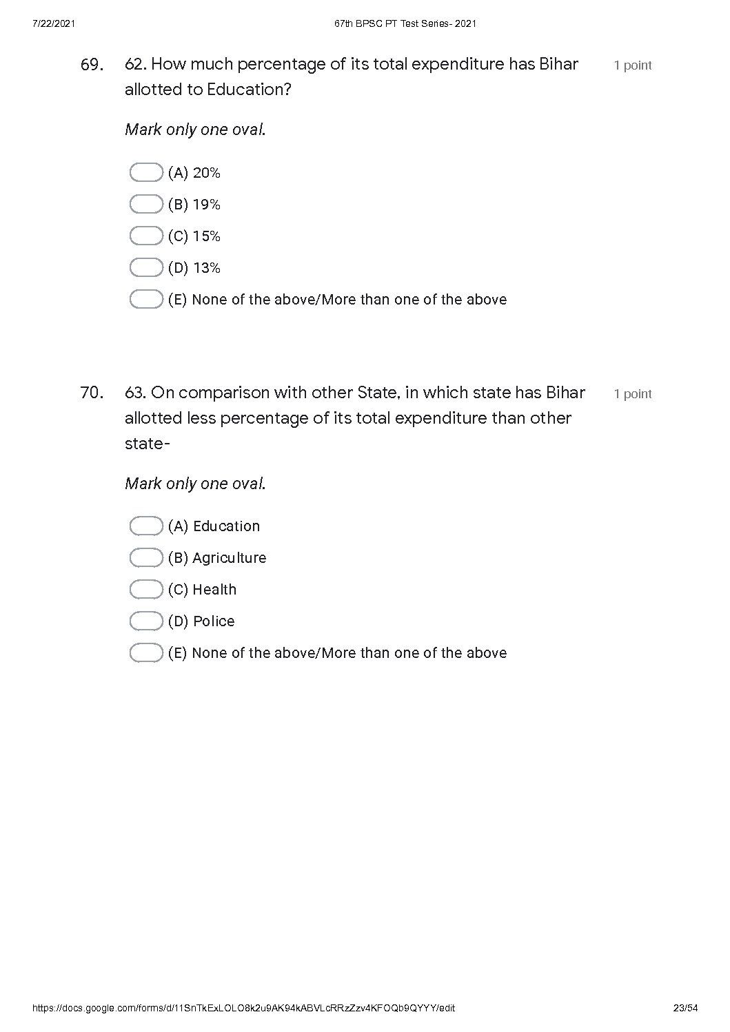 / 67TH B.P.S.C – C.D.P.O -PT TEST SERIES – 2021 TEST-6 ( SUBJECT- BASIC ECONOMY+ECONOMIC SURVEY 2020-21 +BUDGET 2021-22 -INDIA & BIHAR)