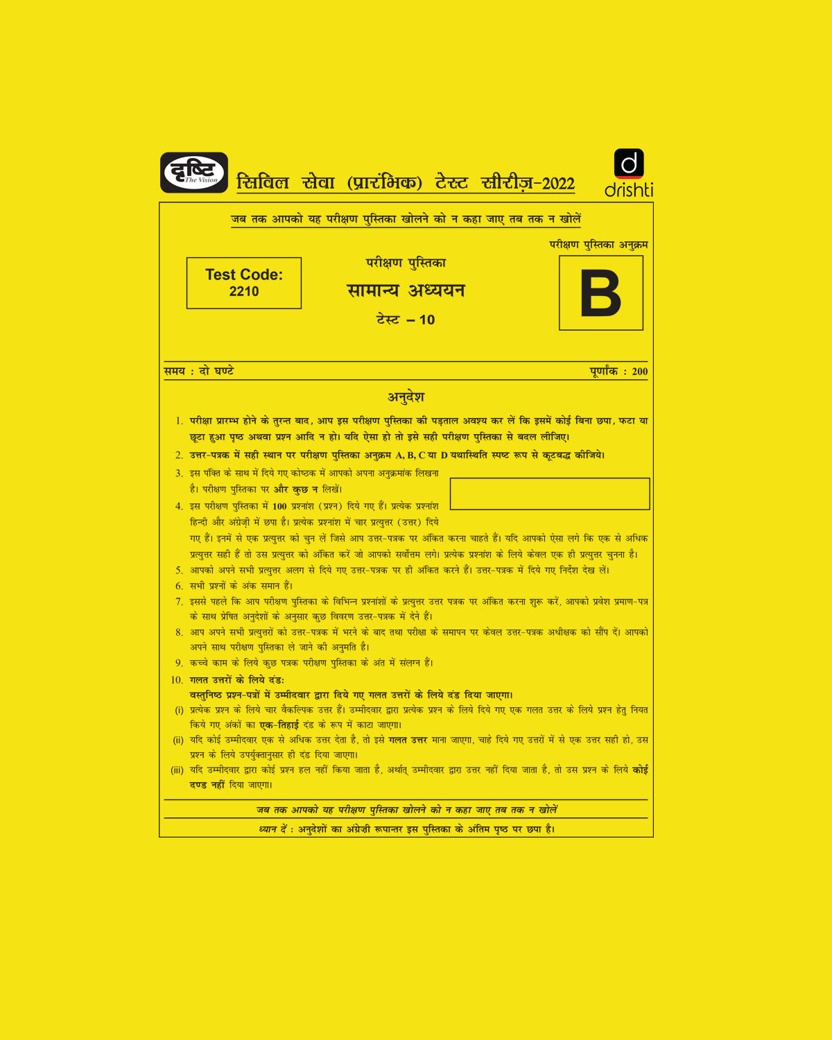 DRISHTI IAS 2022 PRELIMS TEST SERIES (TEST CODE-2210) –TEST-10 HINDI & ENGLISH MEDIUM (BLACK & WHITE)