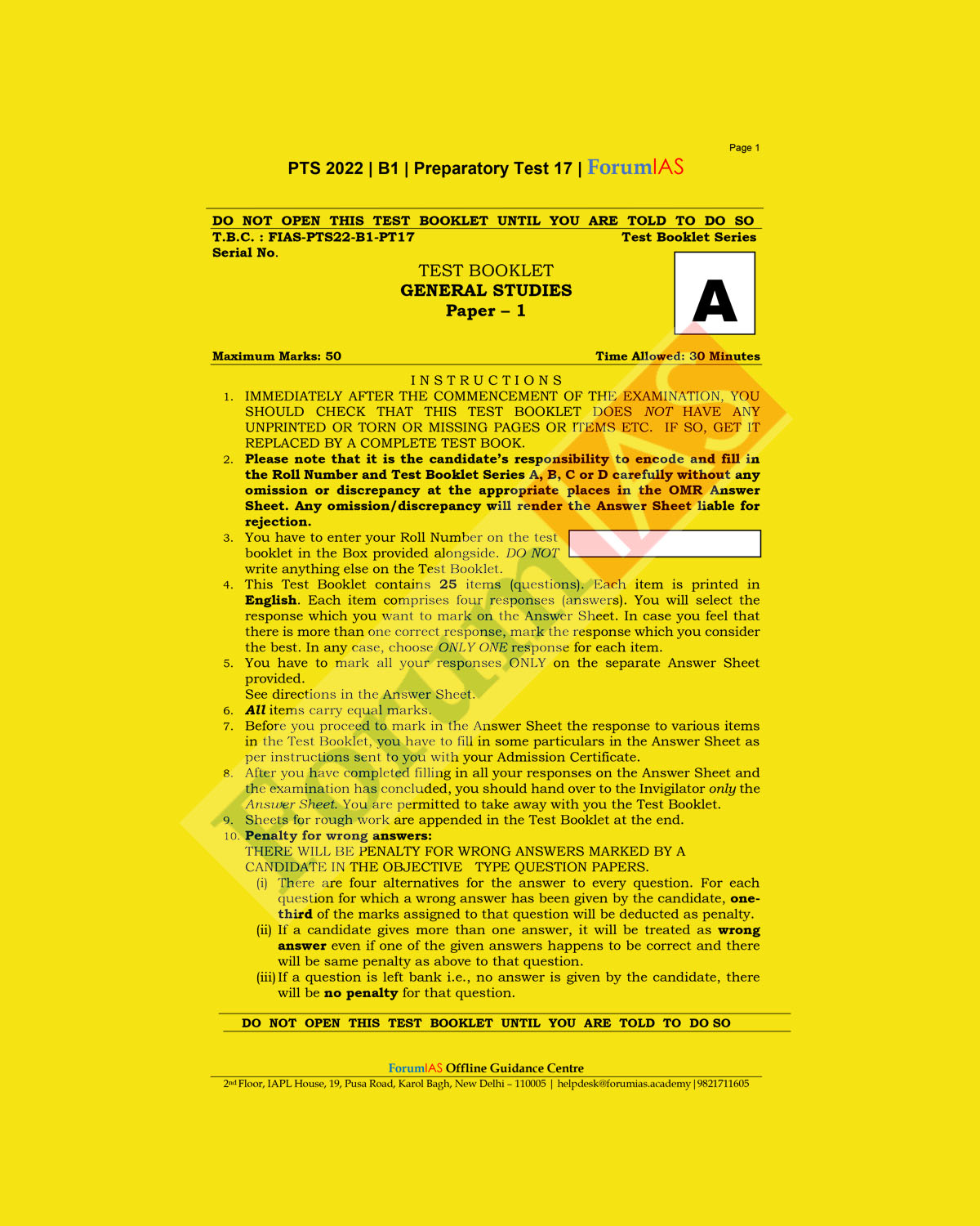 / FORUM IAS 2022 PREPARATORY- TEST-17 PTS-2022-BATCH-1 (B & W)