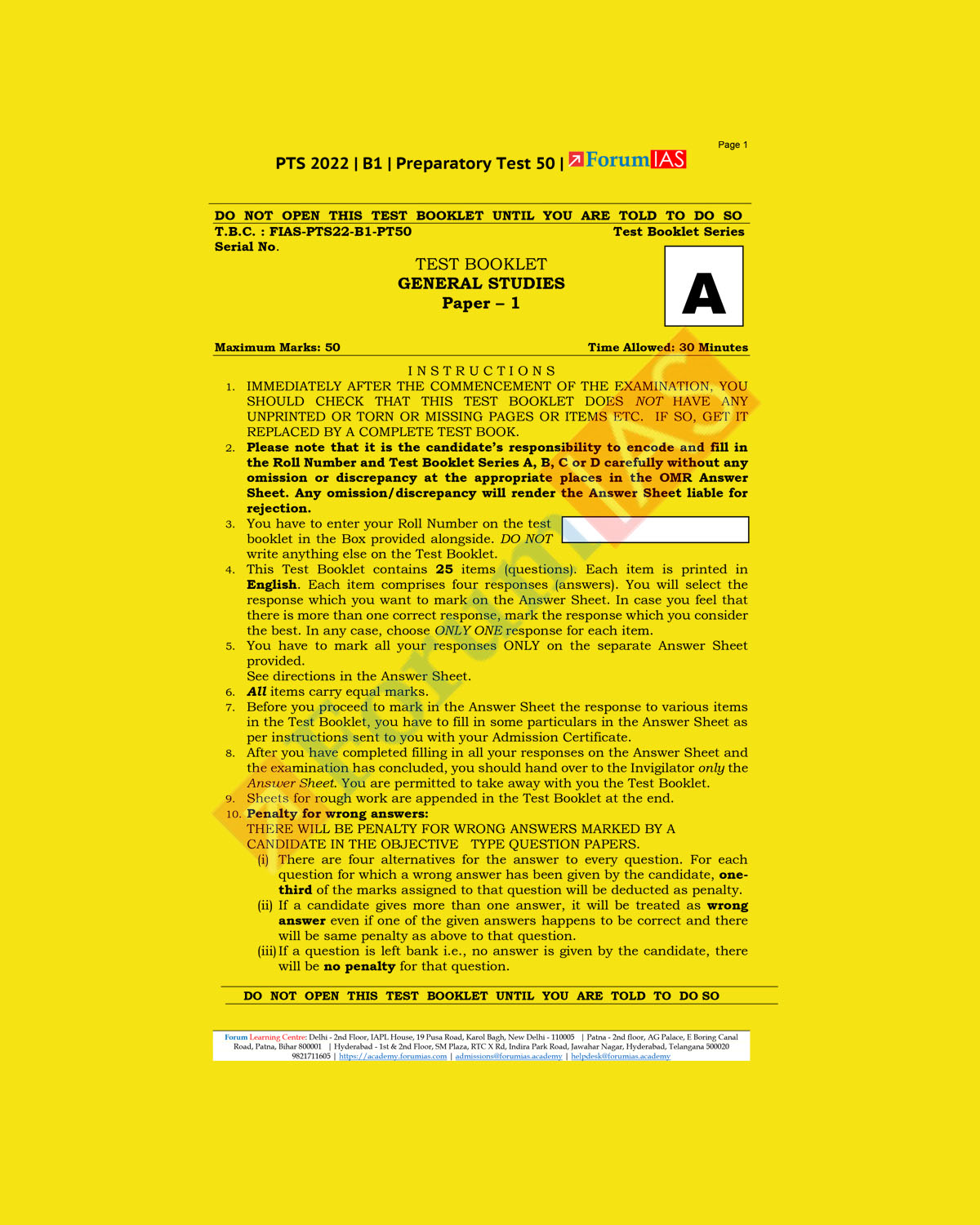 / FORUM IAS 2022 PREPARATORY- TEST-50 (PTS-2022-BATCH-1) (BLACK &WHITE)