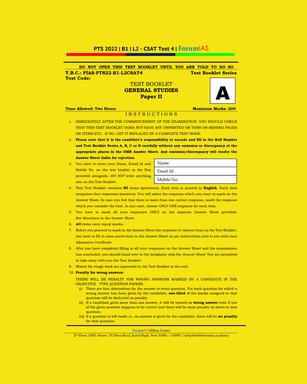 / FORUM IAS GENERAL STUDIES 2022- PTS 2022 BATCH-B-1, L-2- CSAT-TEST-04 (BLACK & WHITE)