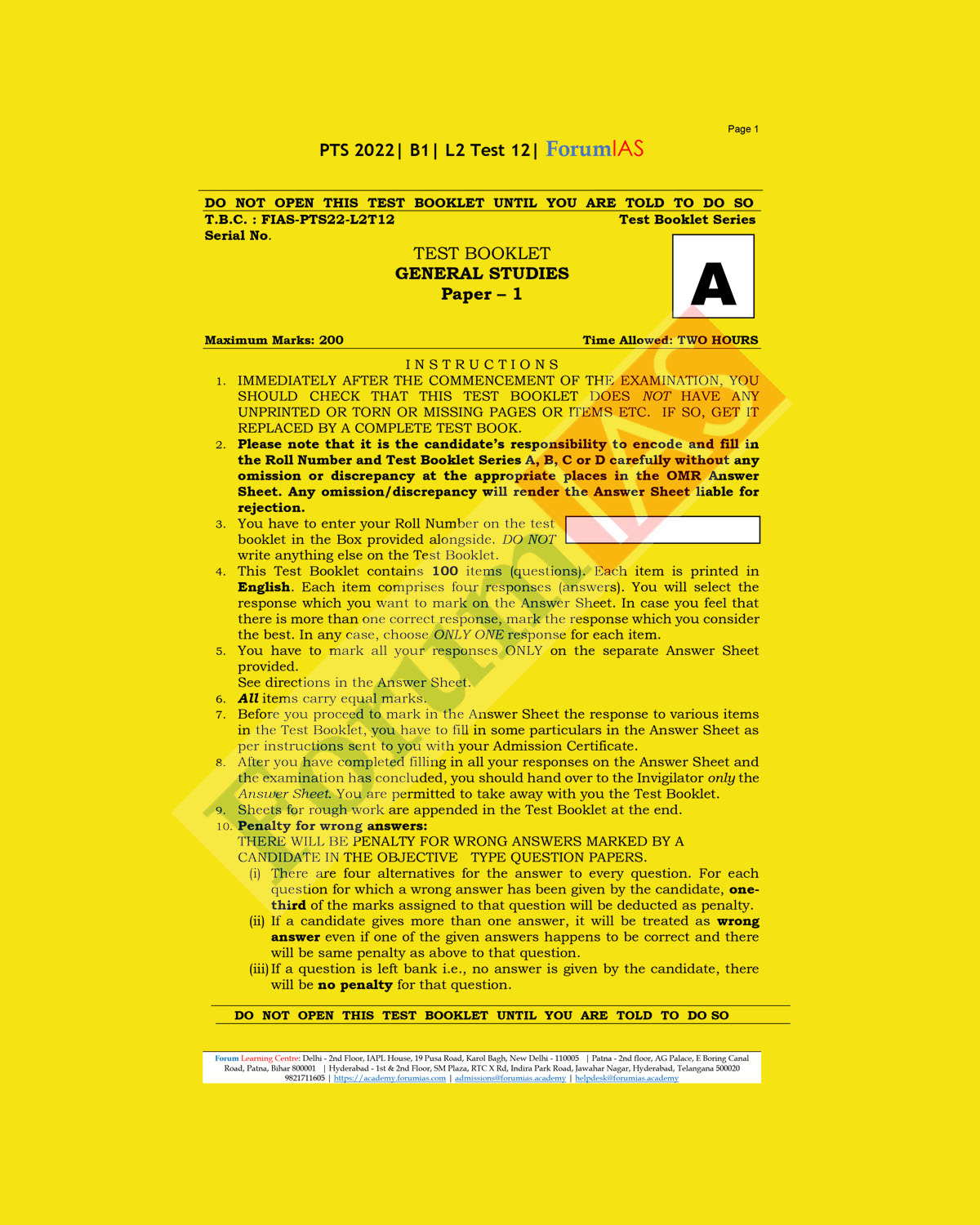 FORUM IAS 2022 PTS 2022 BATCH-B-1, L-2- GS-TEST-12 (BLACK & WHITE) quantity