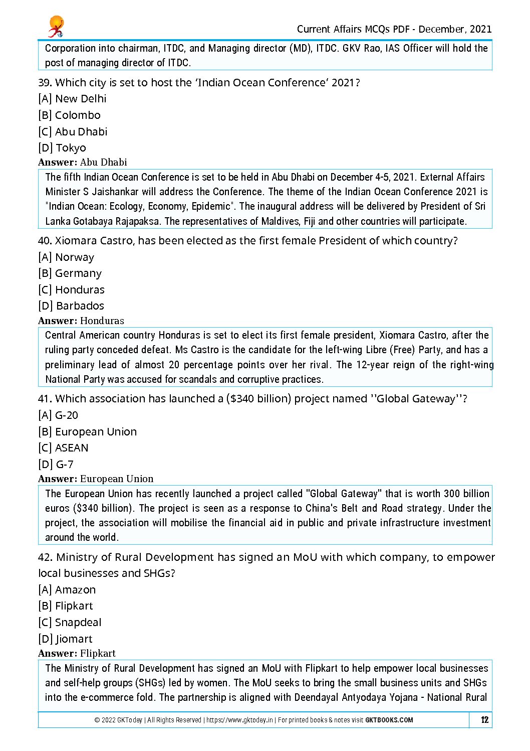 GK TODAY CURRENT AFFAIRS QUIZ DECEMBER 2021(BLACK & WHITE)