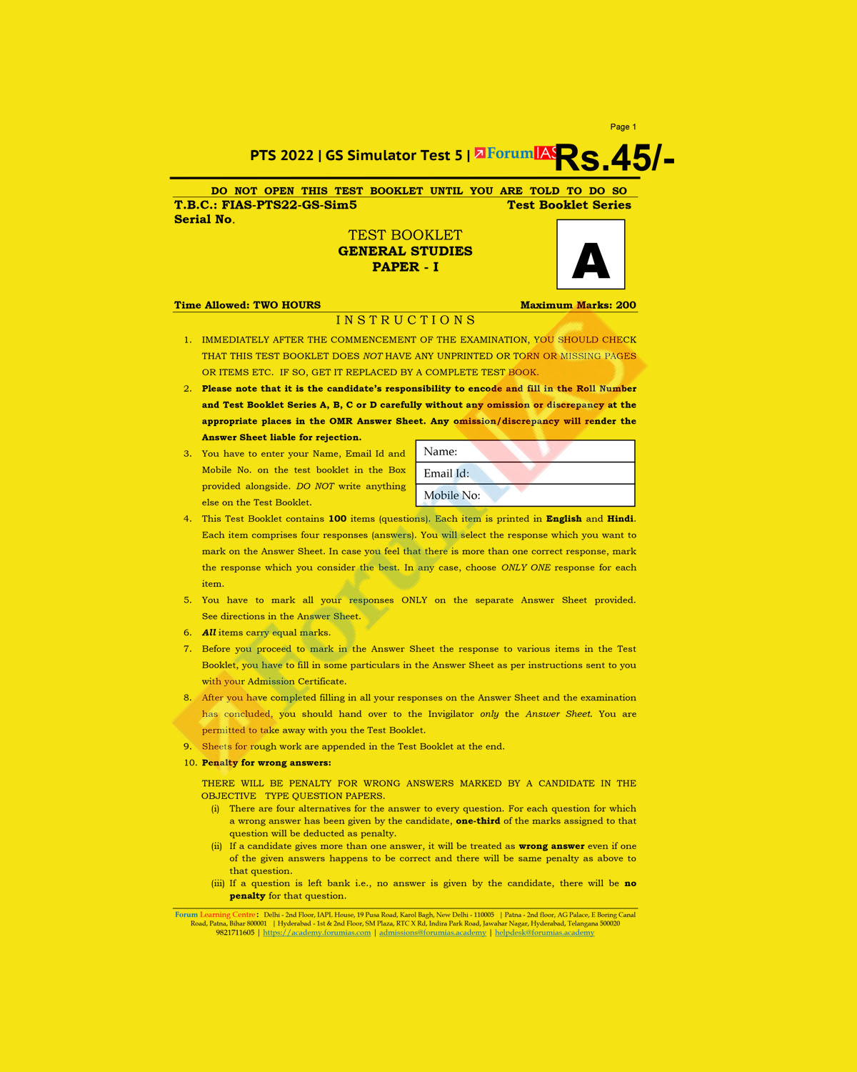 / FORUM IAS 2022 SIMULATOR TEST TEST-5 PTS GENERAL STUDIES PAPER– I (BLACK & WHITE)