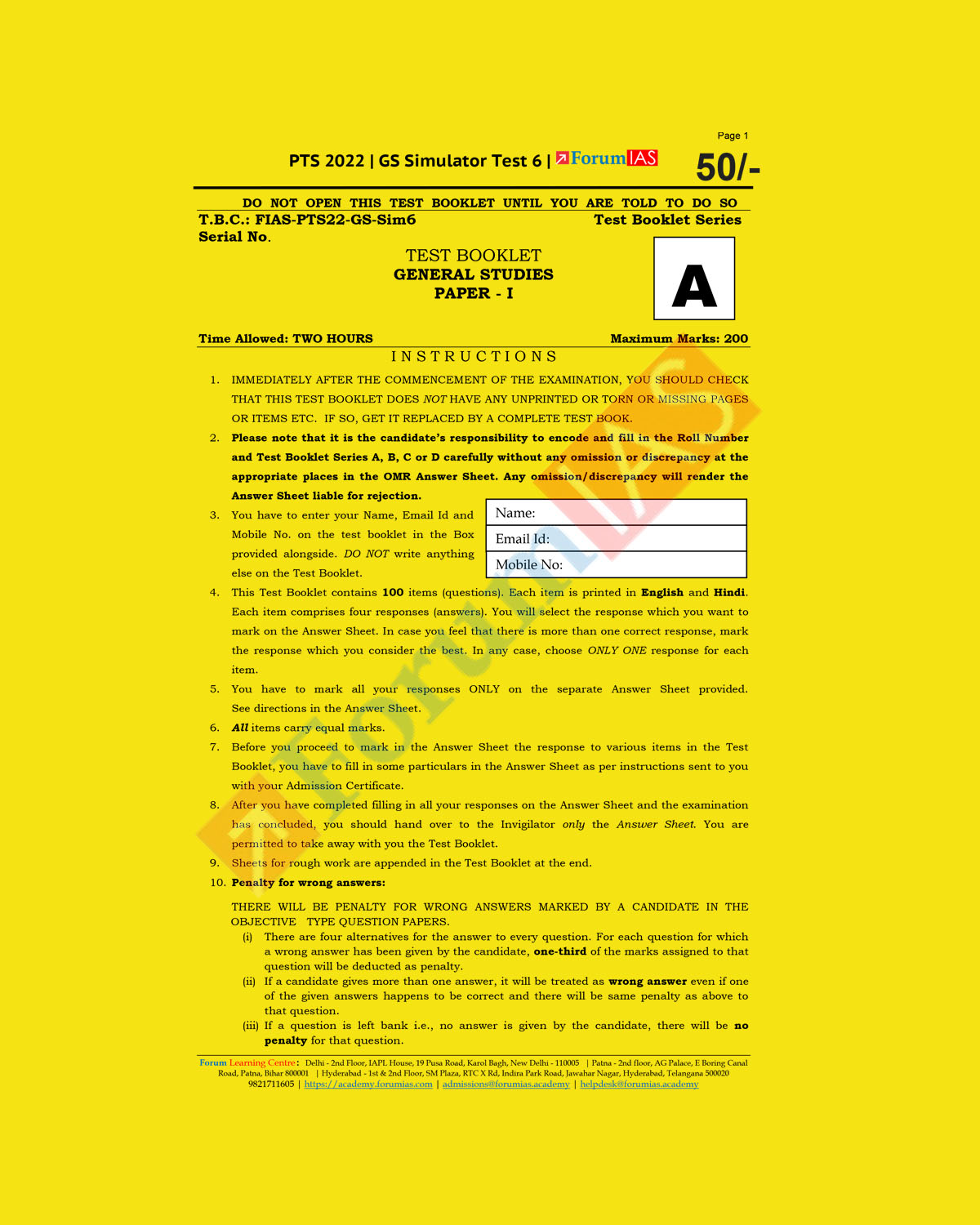 / FORUM IAS 2022 SIMULATOR TESTS TEST-6 PTS GENERAL STUDIES PAPER– I (BLACK & WHITE)