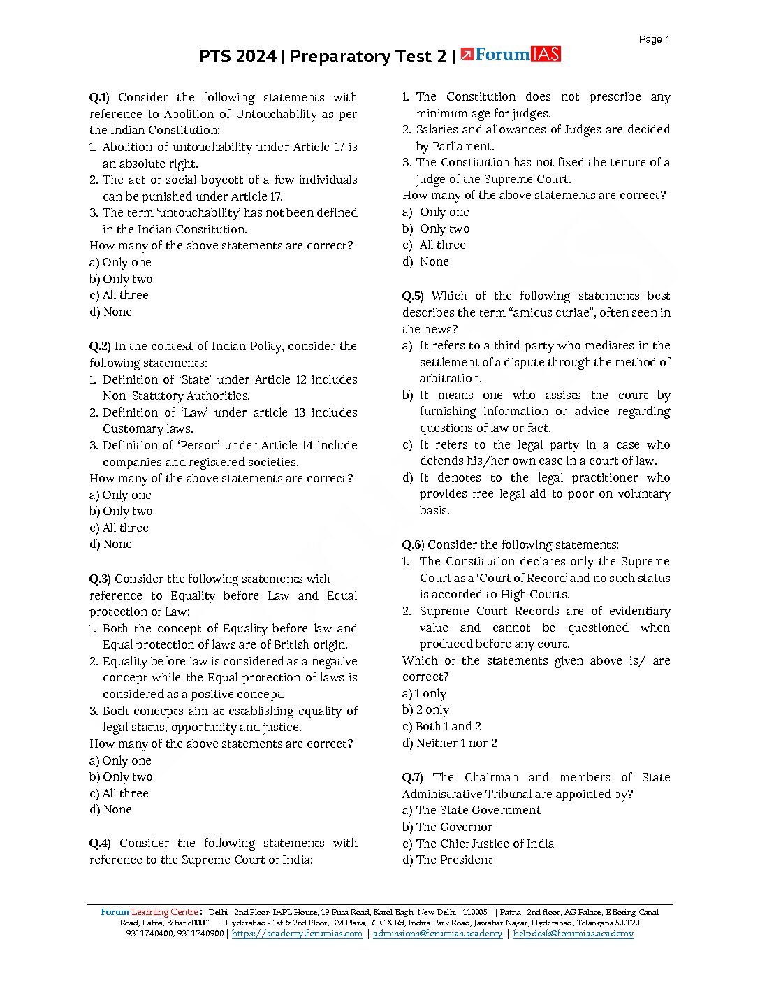 FORUM IAS 2024 PREPARATORY MINI TEST-02 (POLITY) 2024 ENGLISH MEDIUM (BLACK & WHITE)