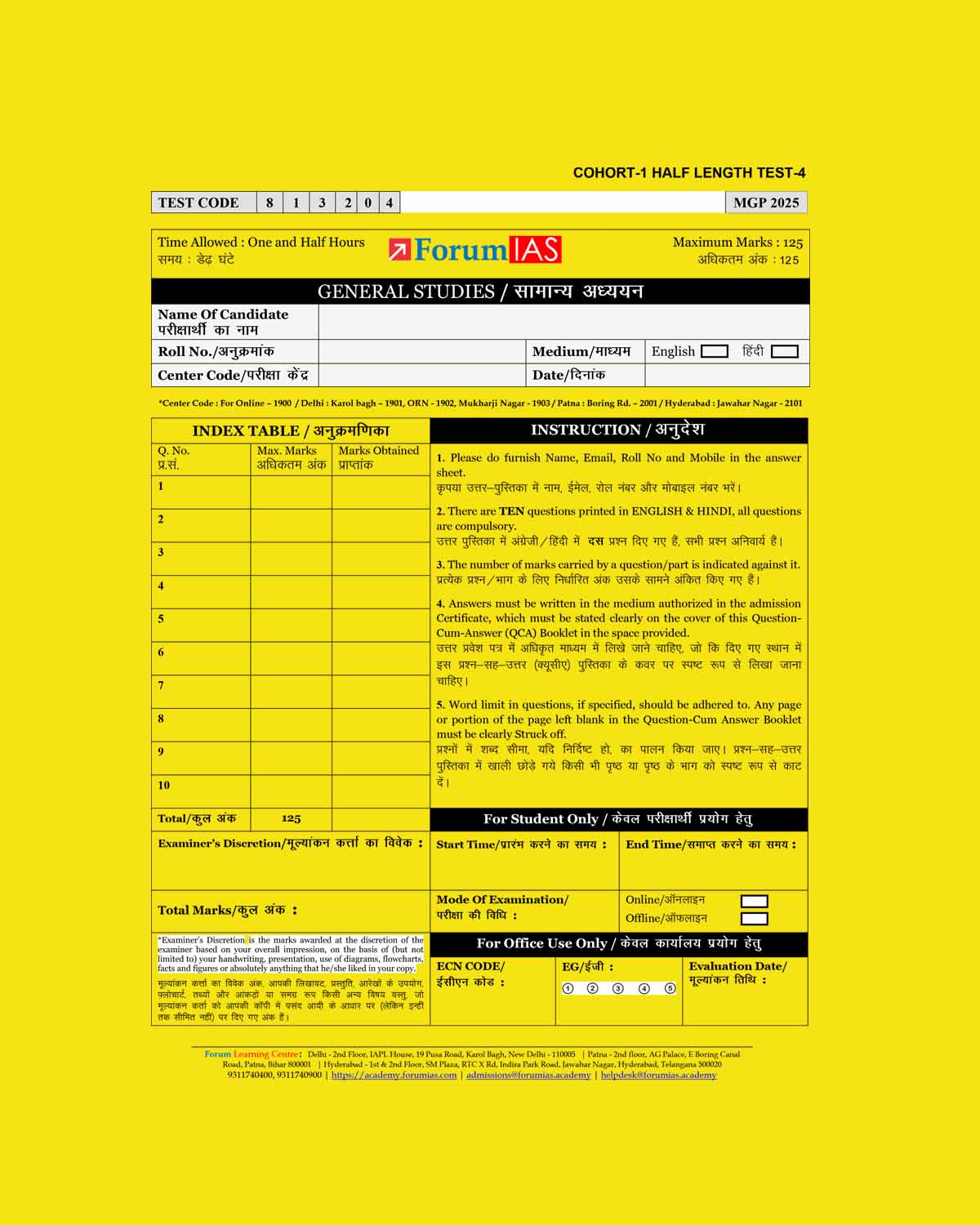 / FORUM IAS 2025 MGP COHART-1 QUESTION CUM ANSWER BOOKLETS HALF LENGTH TEST-4-QCA FINAL (ENGLISH & HINDI) {BLACK & WHITE}