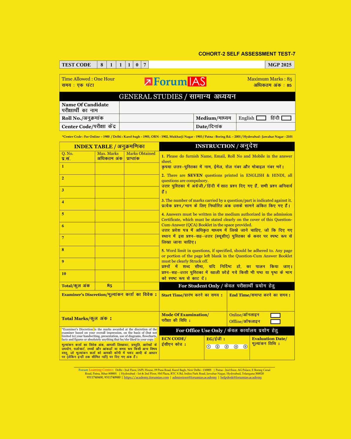 FORUM IAS 2025 MGP COHART-2 QUESTION CUM ANSWER BOOKLETS SELF ASSESSMENT TEST-7 -QCA FINAL (ENGLISH & HINDI) {BLACK & WHITE}