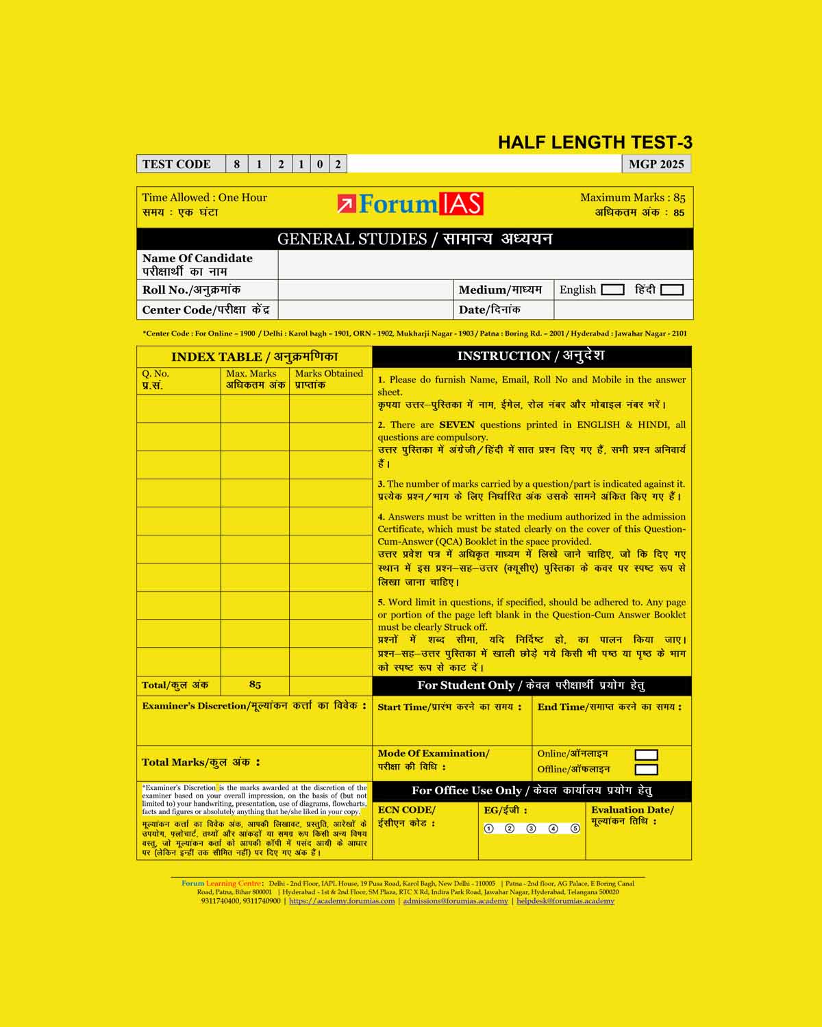 / FORUM IAS 2025 MGP COHORT-3 QUESTION CUN ANSWER BOOKLETS TEST-3 ANSWERS BOOKLET 2025 FINAL (ENGLISH & HINDI) {BLACK AND WHITE}