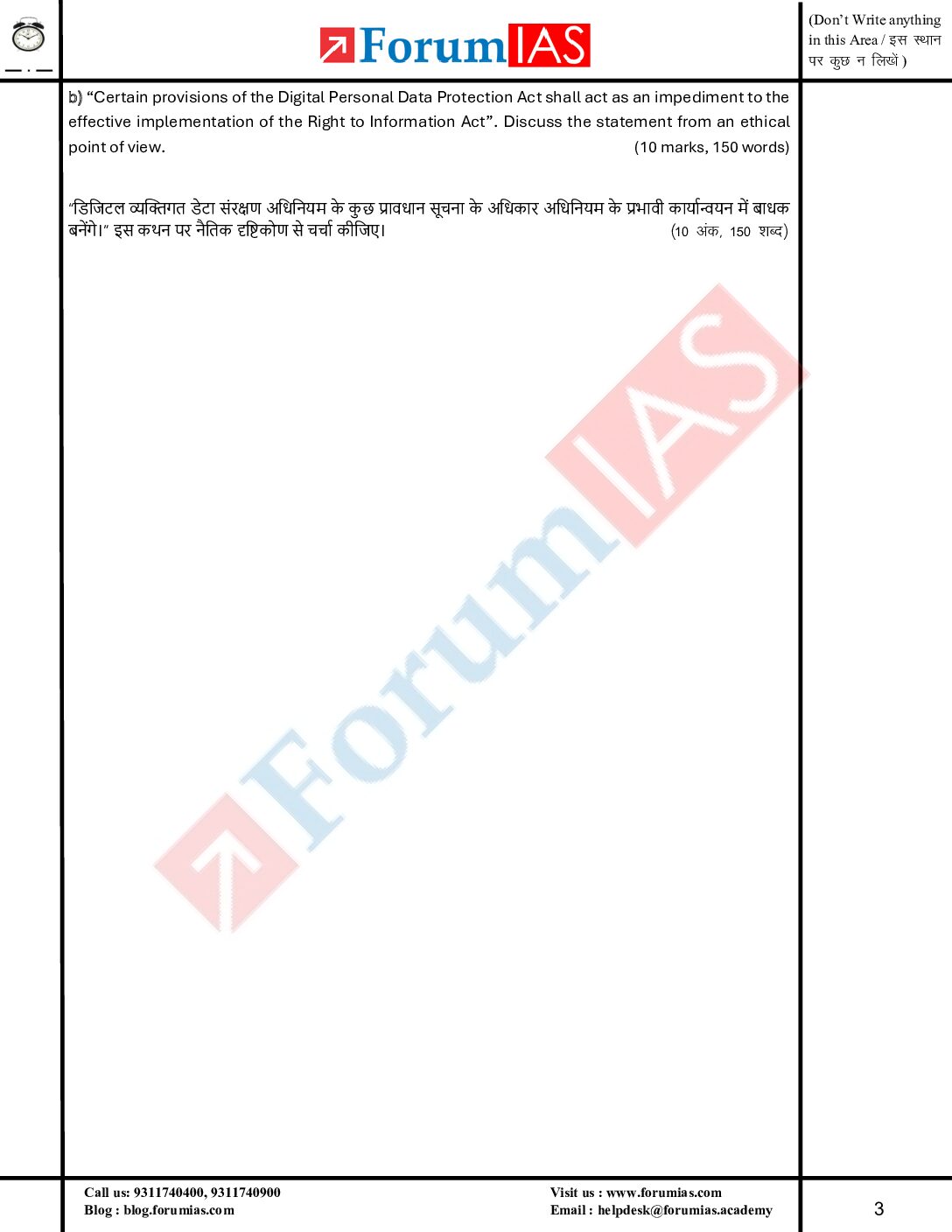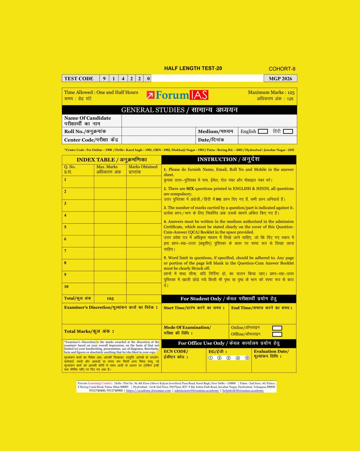 / FORUM IAS 2026 MGP (COHART-8) QUESTION CUM ANSWER BOOKLETS HALF LENGTH TEST-20-QCA FINAL (ENGLISH) {BLACK AND WHITE}