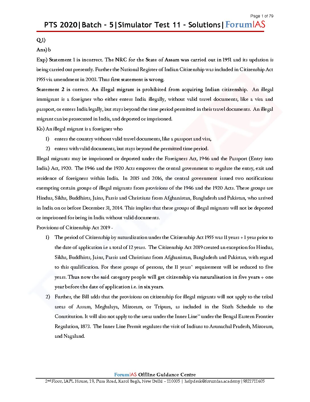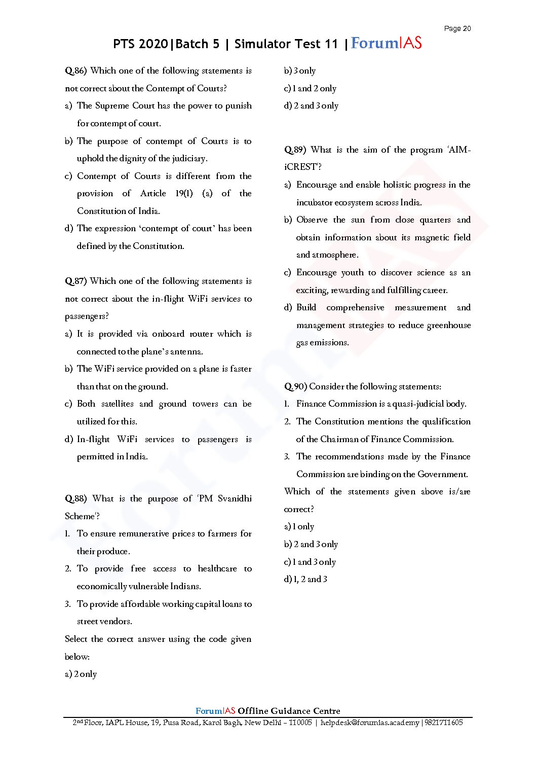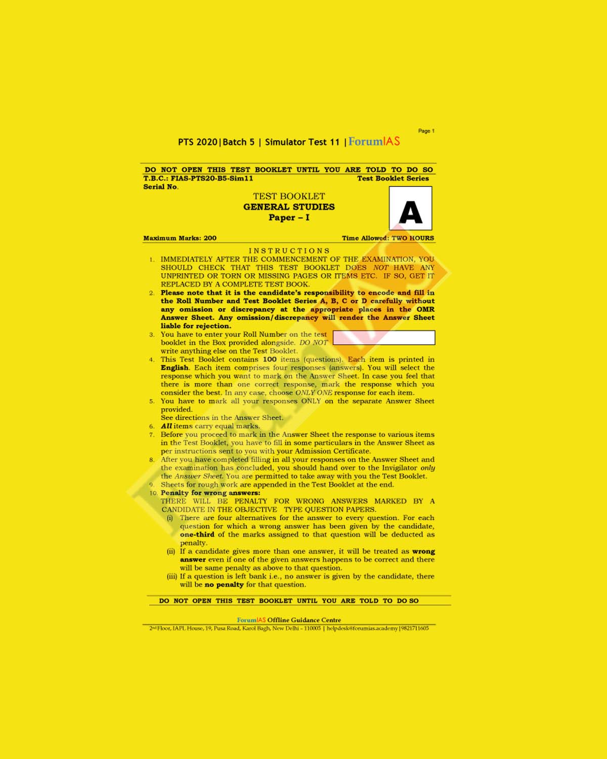 / FORUM IAS BATCH – 5 SIMULATOR TEST – 11 TEST BOOKLET GENERAL STUDIES PAPER – 1 – 2020