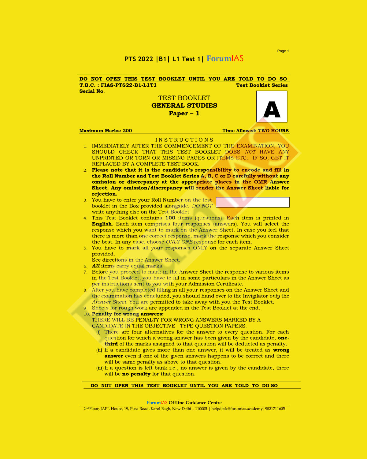 FORUM IAS GENERAL STUDIES BATCH-B-1, L-1- G.S.-TEST-1 PTS 2022 (BLACK & WHITE)
