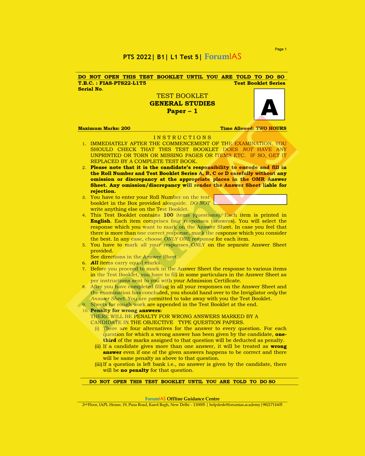 / FORUM IAS GENERAL STUDIES BATCH-B-1, L-1- G.S.-TEST-5 PTS 2022 (BLACK & WHITE)