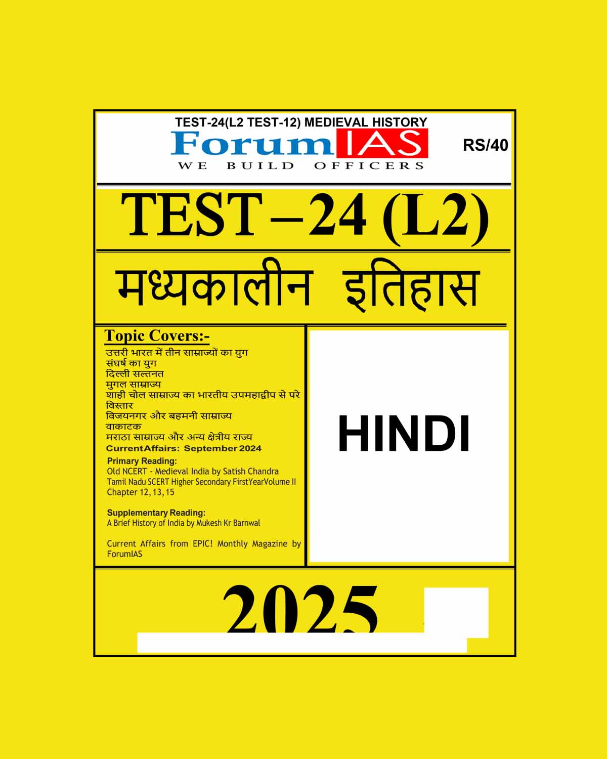 FORUM IAS HINDI 2025 TEST-24 (L2 TEST-12) MEDIEVAL HISTORY 2025 FINAL HINDI {BLACK AND WHITE} quantity