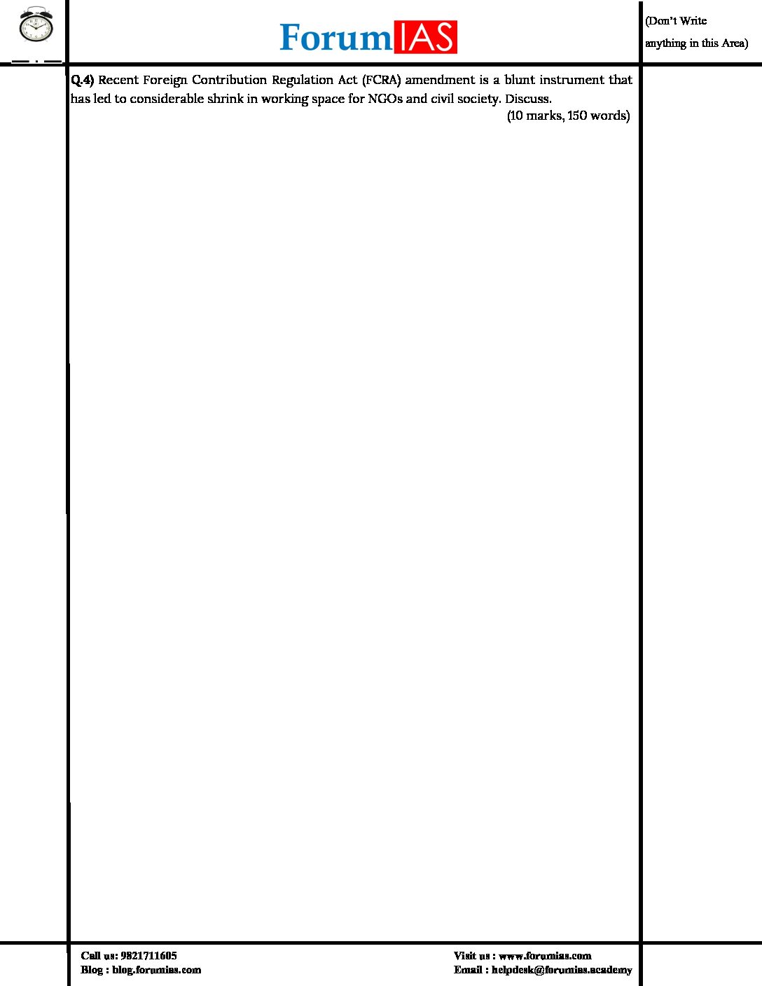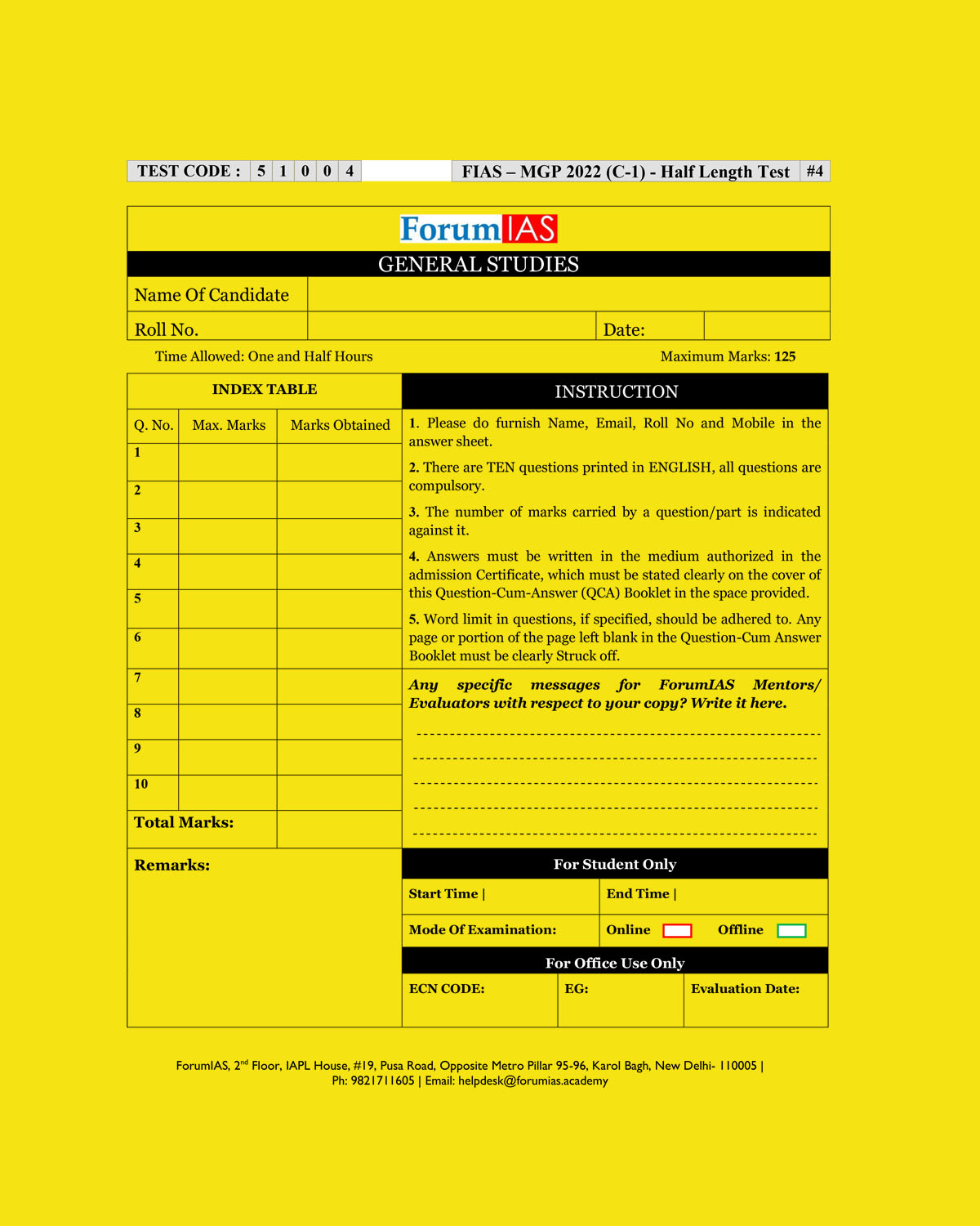 / FORUM IAS MGP -2022- (COHORT-1) –HALF LENGTH- (TEST CODE-51004) -TEST-4 QUESTION –CUM- ANSWERS BOOKLET (BLACK & WHITE)