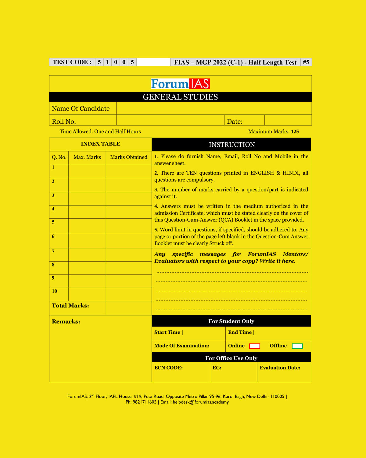 / FORUM IAS MGP -2022- (COHORT-1) –HALF LENGTH- (TEST CODE-51005) -TEST-5 QUESTION –CUM- ANSWERS BOOKLET (BLACK & WHITE)