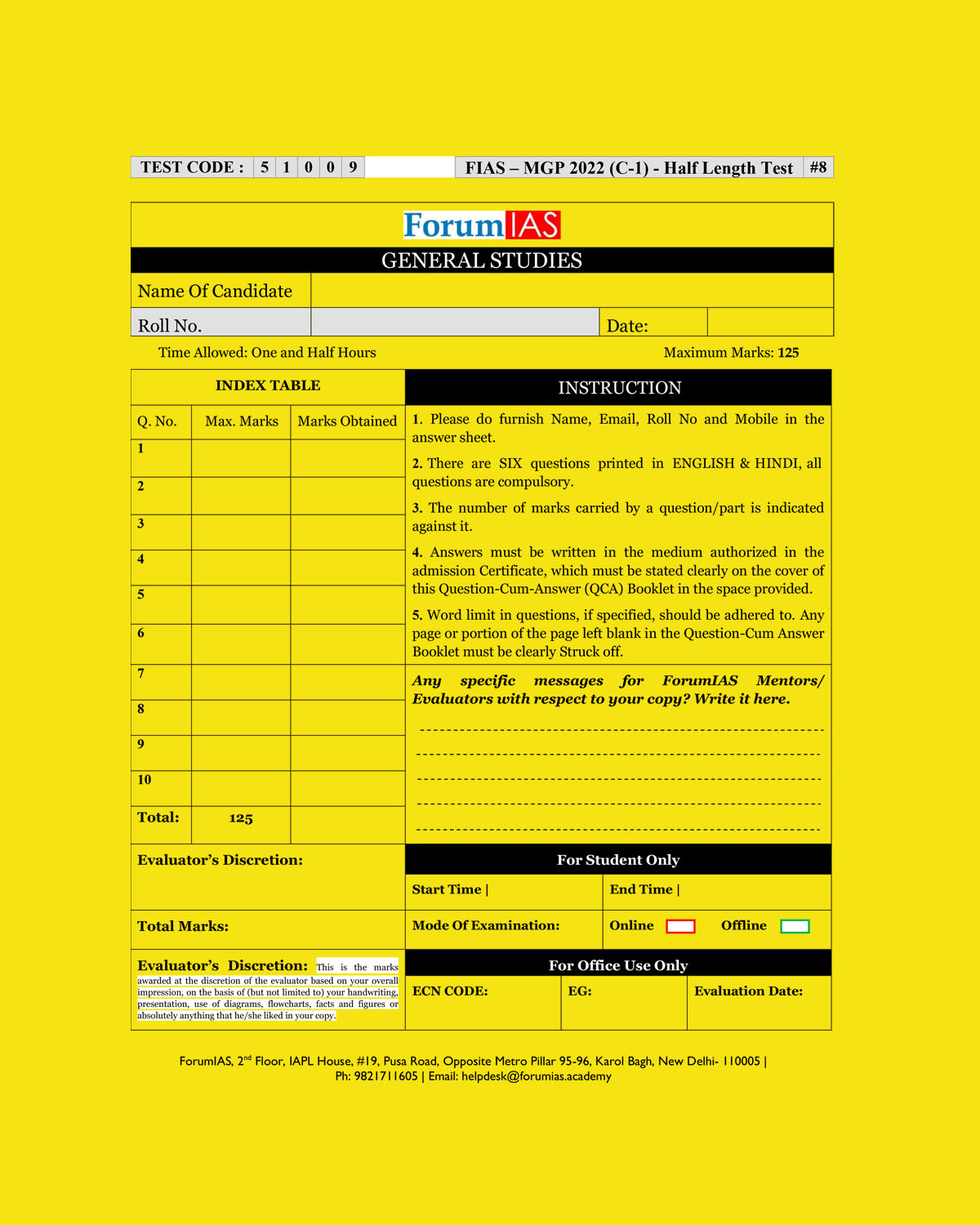 FORUM IAS MGP -2022- (COHORT-1) –HALF LENGTH- (TEST CODE-51009) -TEST-8 QUESTION –CUM- ANSWERS BOOKLET (BLACK & WHITE)