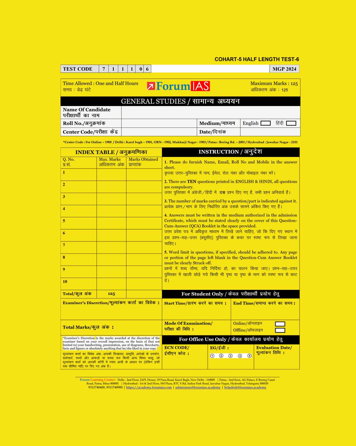 FORUM IAS MGP 2024 COHORT-5 QUESTION CUM ANSWER BOOKLETS HALF LENGTH TEST-6 QUESTION CUM -ANSWERS BOOKLET FINAL {BLACK AND WHITE}
