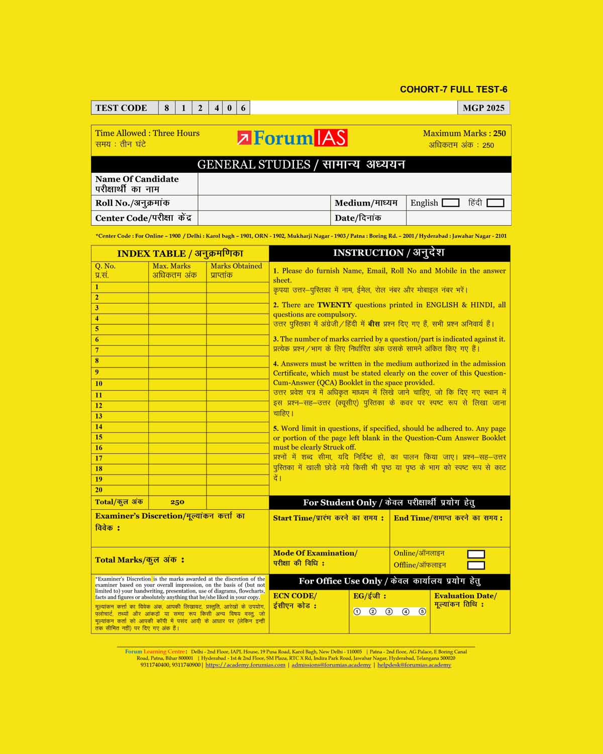 FORUM IAS MGP (COHORT-7) 2025 QUESTION CUM ANSWER BOOKLET FULL LENGTH TEST-6-QCA FINAL (ENGLISH & HINDI) {BLACK AND WHITE}
