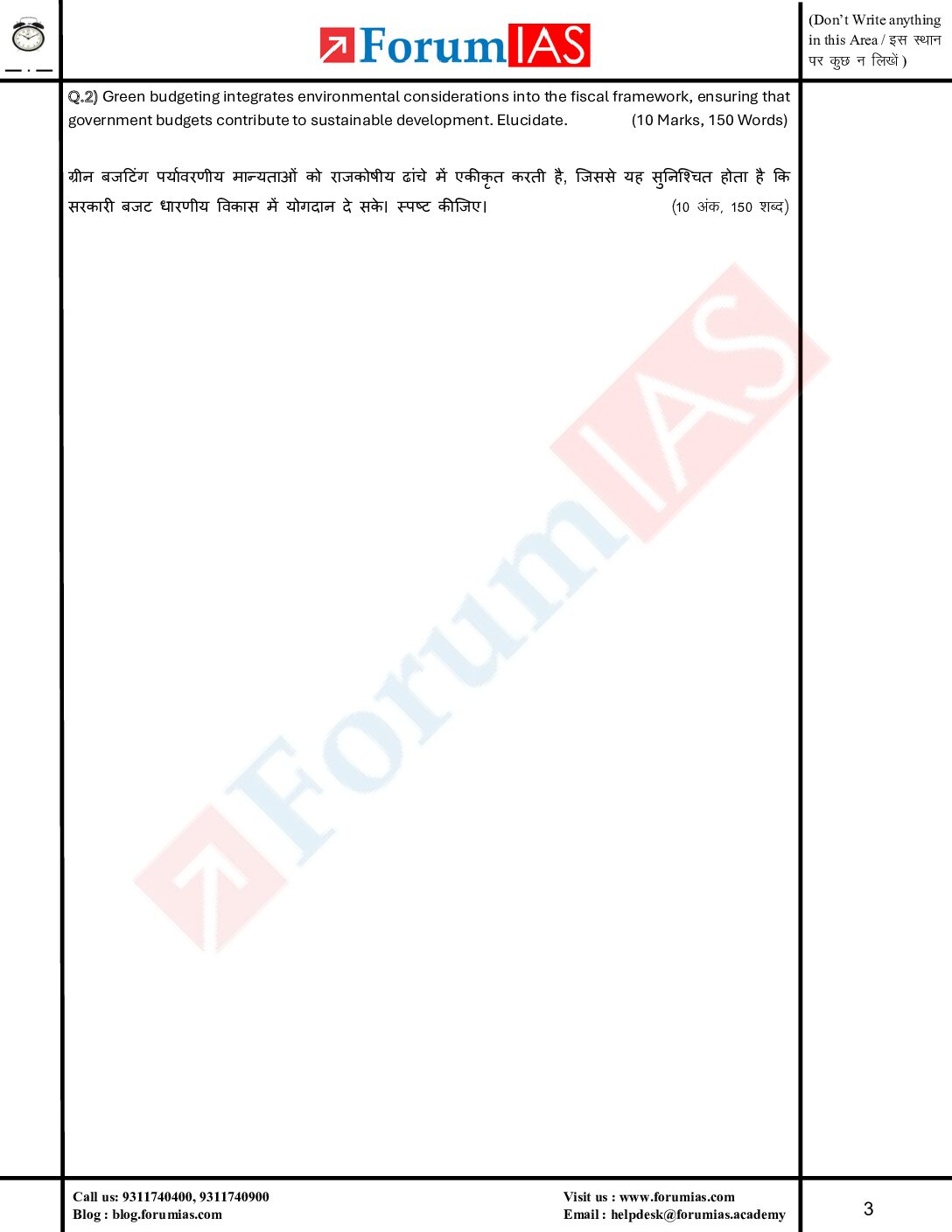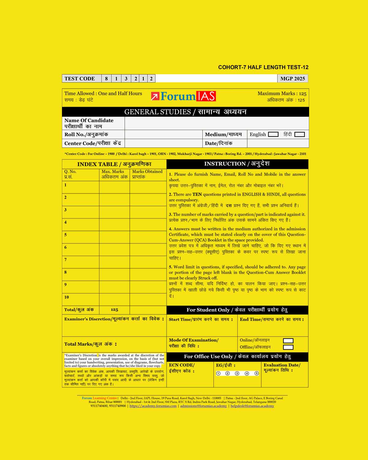 FORUM IAS MGP (COHORT-7) 2025 QUESTION CUM ANSWER BOOKLET HALF LENGTH TEST-12-QCA FINAL (ENGLISH & HINDI) {BLACK AND WHITE}