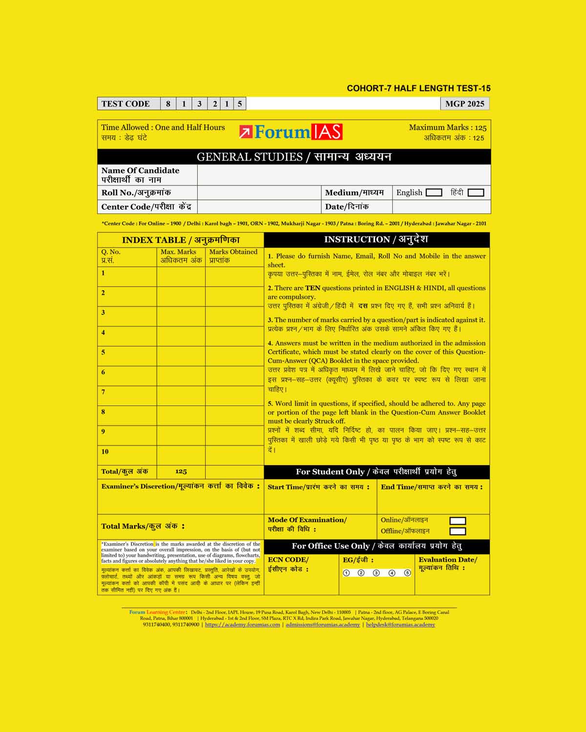 / FORUM IAS MGP (COHORT-7) 2025 QUESTION CUM ANSWER BOOKLET HALF LENGTH TEST-15-QCA FINAL (ENGLISH & HINDI) {BLACK AND WHITE}