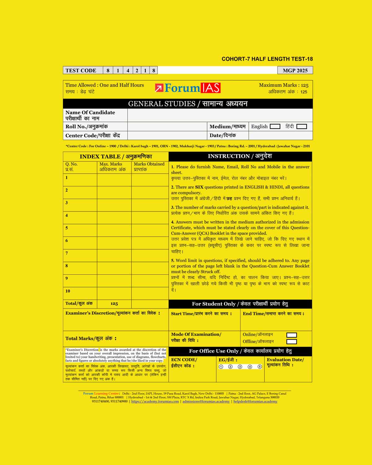 / FORUM IAS MGP (COHORT-7) 2025 QUESTION CUM ANSWER BOOKLET HALF LENGTH TEST-18-QCA FINAL (ENGLISH & HINDI) {BLACK AND WHITE}