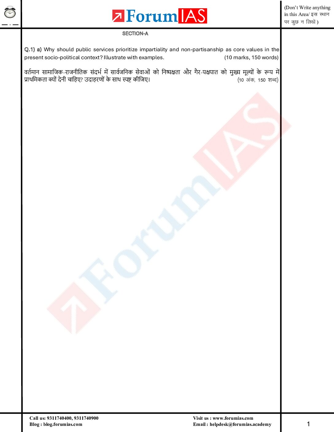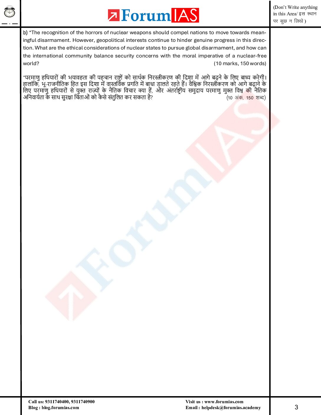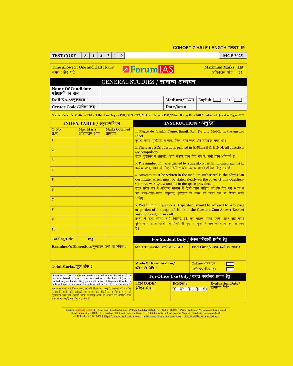 FORUM IAS MGP (COHORT-7) 2025 QUESTION CUM ANSWER BOOKLET HALF LENGTH TEST-19-QCA FINAL (ENGLISH & HINDI) {BLACK AND WHITE}