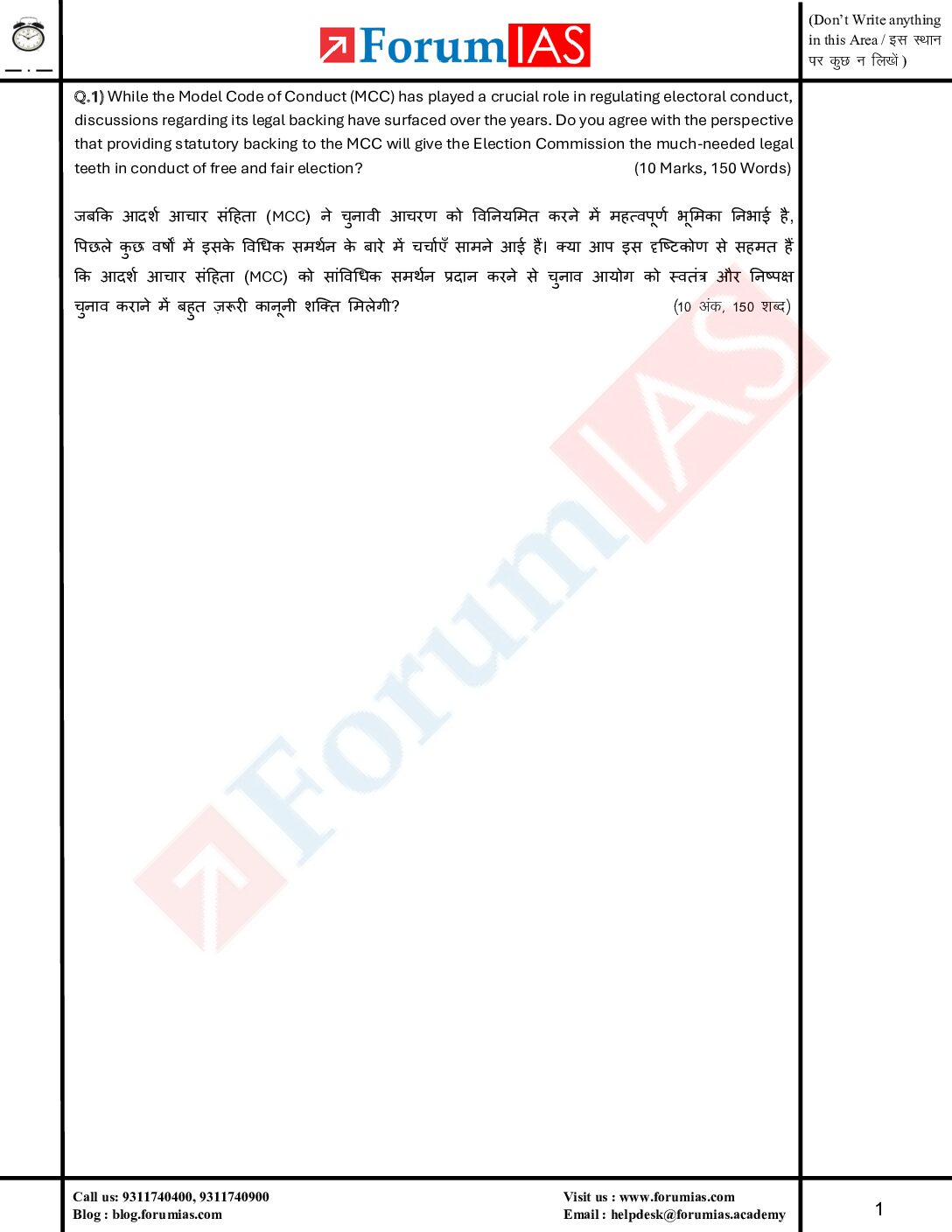 FORUM IAS MGP (COHORT-7) 2025 QUESTION CUM ANSWER BOOKLET HALF LENGTH TEST-9-QCA FINAL (ENGLISH & HINDI) {BLACK AND WHITE}