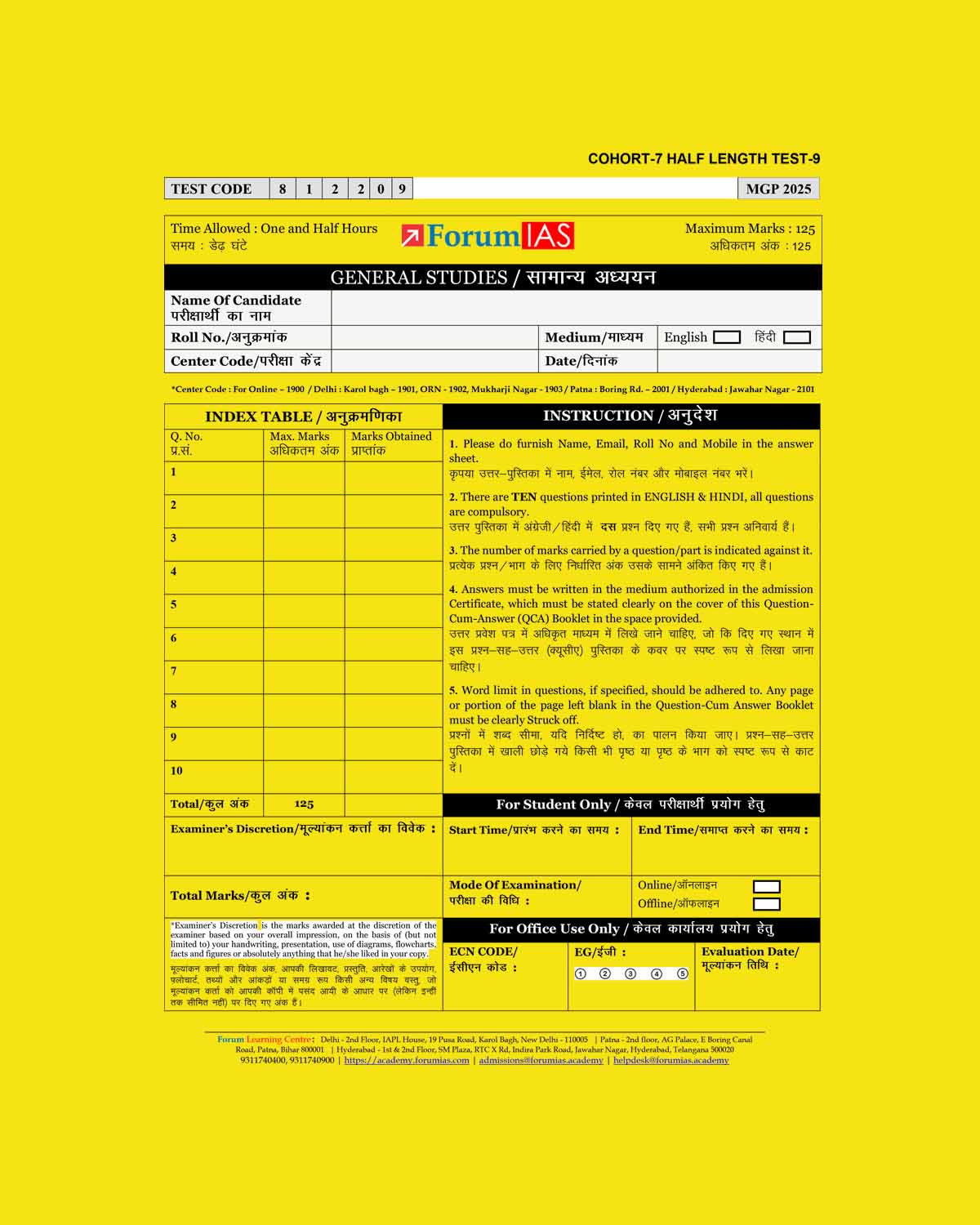 / FORUM IAS MGP (COHORT-7) 2025 QUESTION CUM ANSWER BOOKLET HALF LENGTH TEST-9-QCA FINAL (ENGLISH & HINDI) {BLACK AND WHITE}