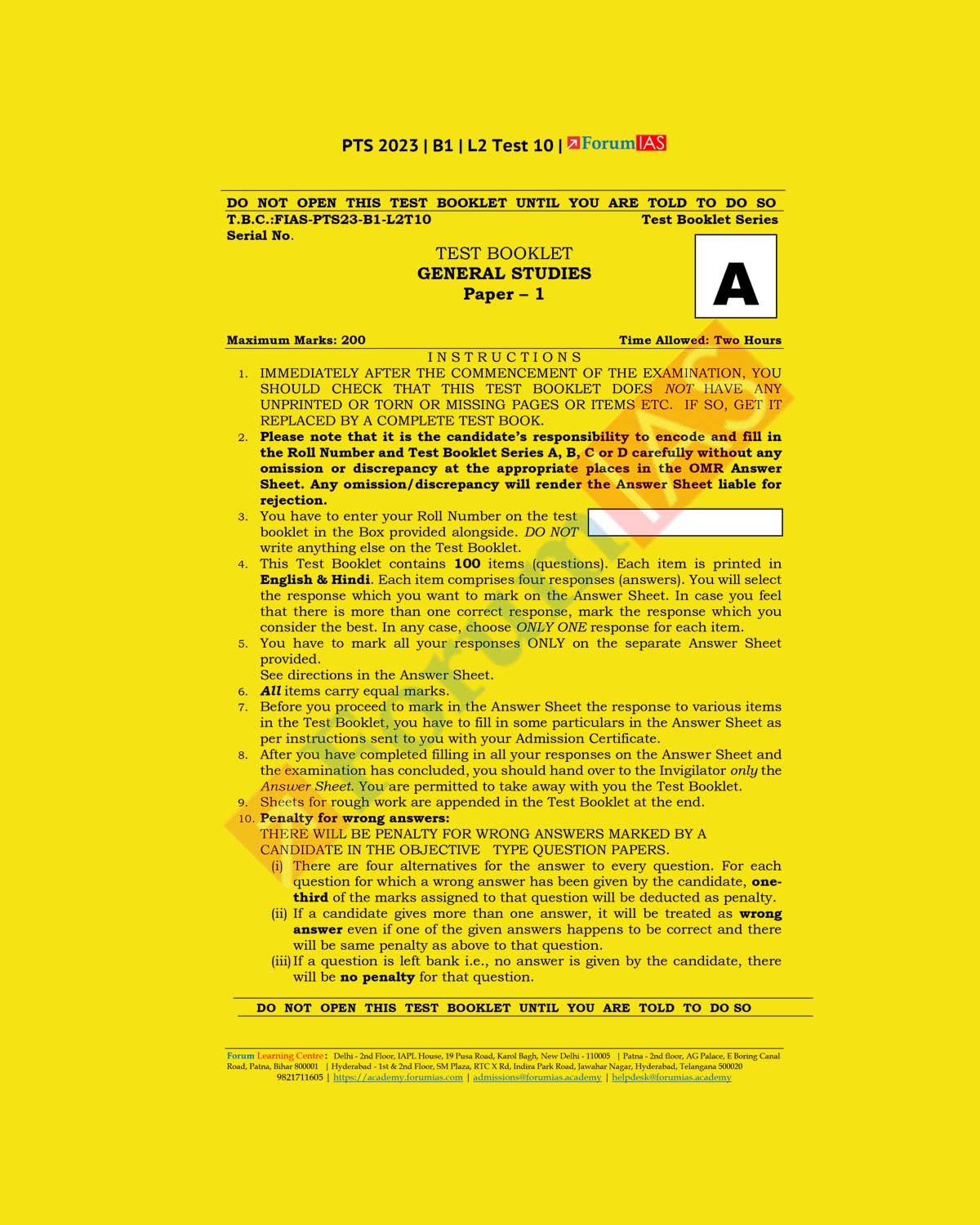 FORUM IAS PTS 2023 BATCH1 TEST-10 BATCH-1 LEVEL-2 GS PAPER 1 (BLACK & WHITE) quantity