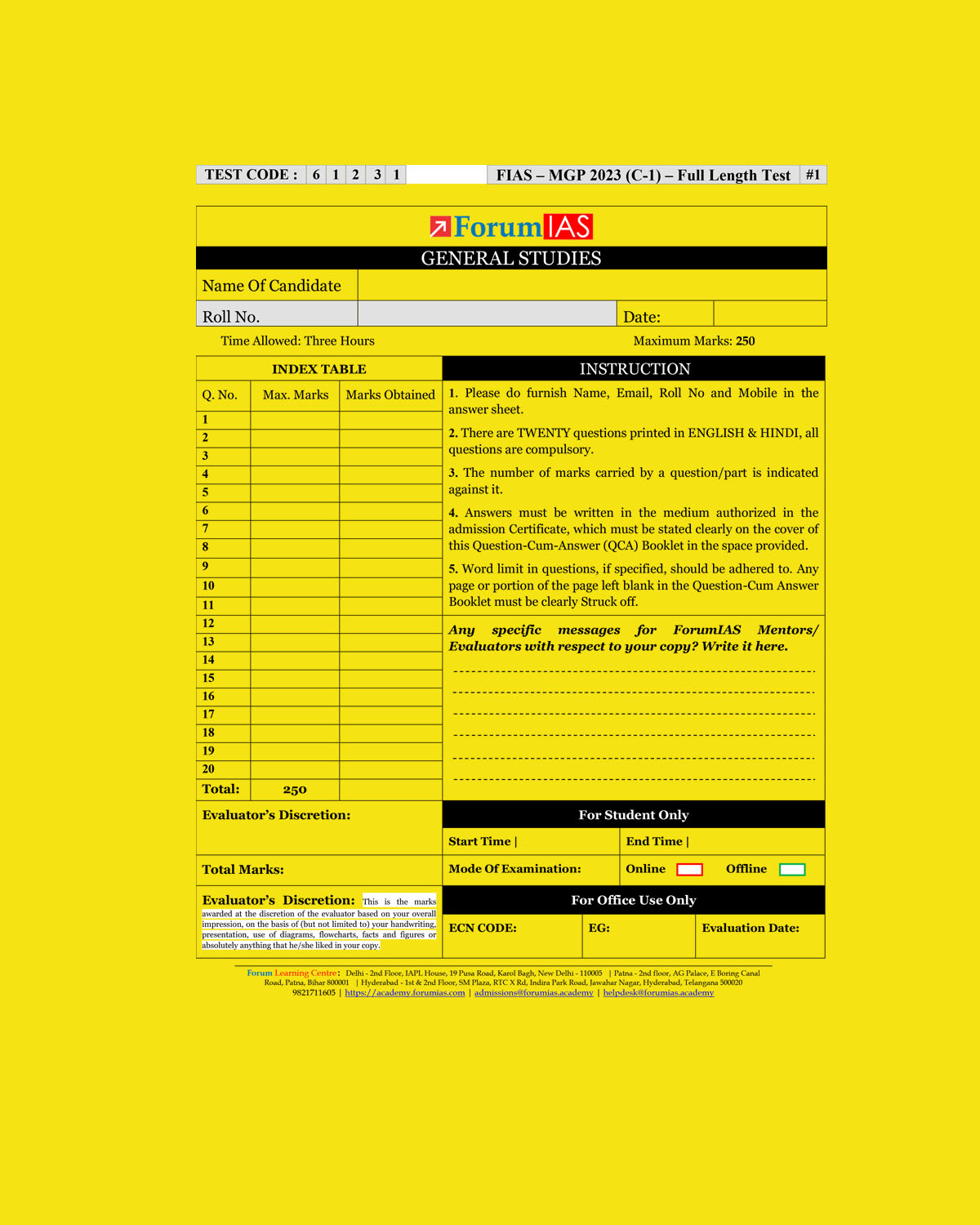 FORUMIAS 2023 MGP COHORT 3 QCA TEST-1 (TESTCODE 61001) (HALF LENGTH) QUESTION CUM ANSWER BOOKLETS (QCA) (BLACK & WHITE)