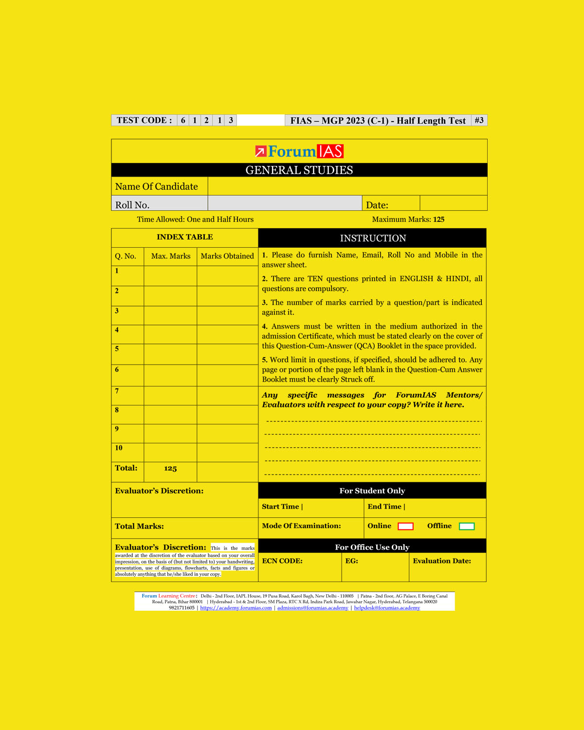 / FORUMIAS 2023 MGP COHORT 1 QCA TEST-3 (TEST CODE 61213) (HALF LENGTH) QUESTION CUM ANSWER BOOKLETS (QCA) (BLACK & WHITE)