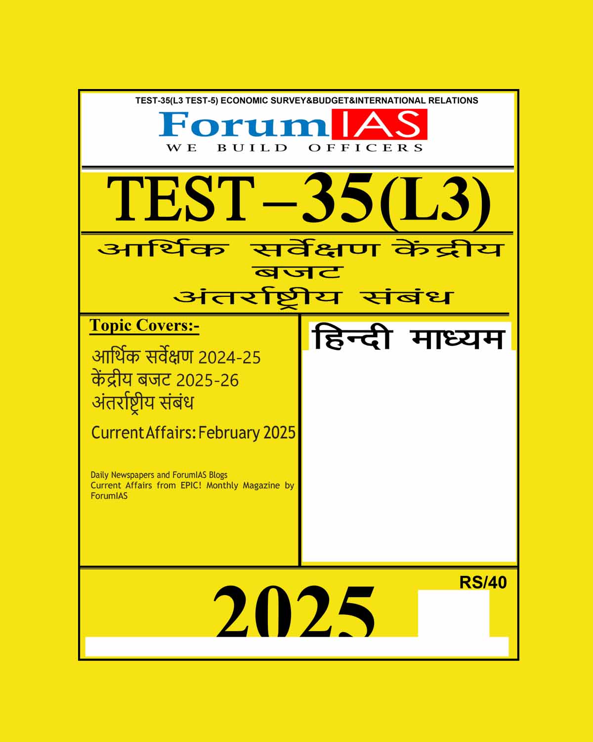 FORUMIAS HINDI 2025 TEST-35 (L3 TEST-5) ECONOMIC SURVEY & BUDGET & INTERNATIONAL RELATIONS 2025 FINAL HINDI {BLACK AND WHITE}