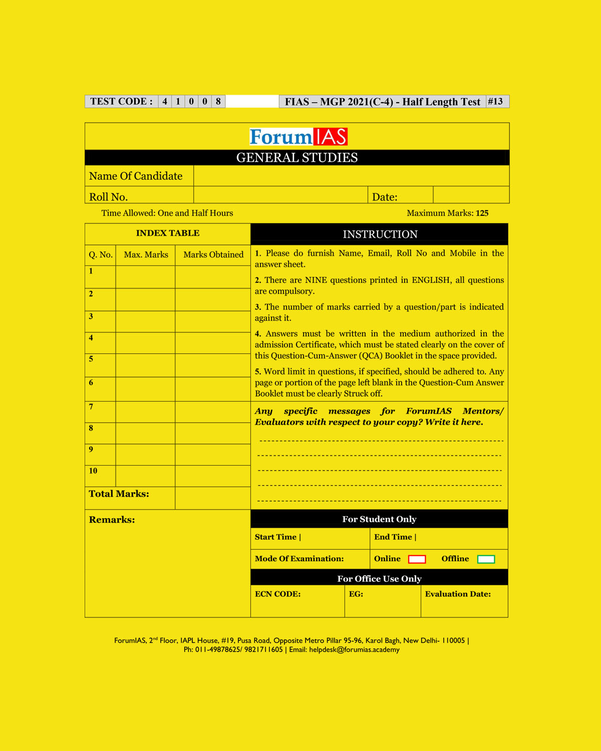 / FORUMIAS MGP 2021(COHORT 4 ) HALF LENGTH TEST-13 (2021) QUESTION –CUM- ANSWERS BOOKLET (BLACK & WHITE)