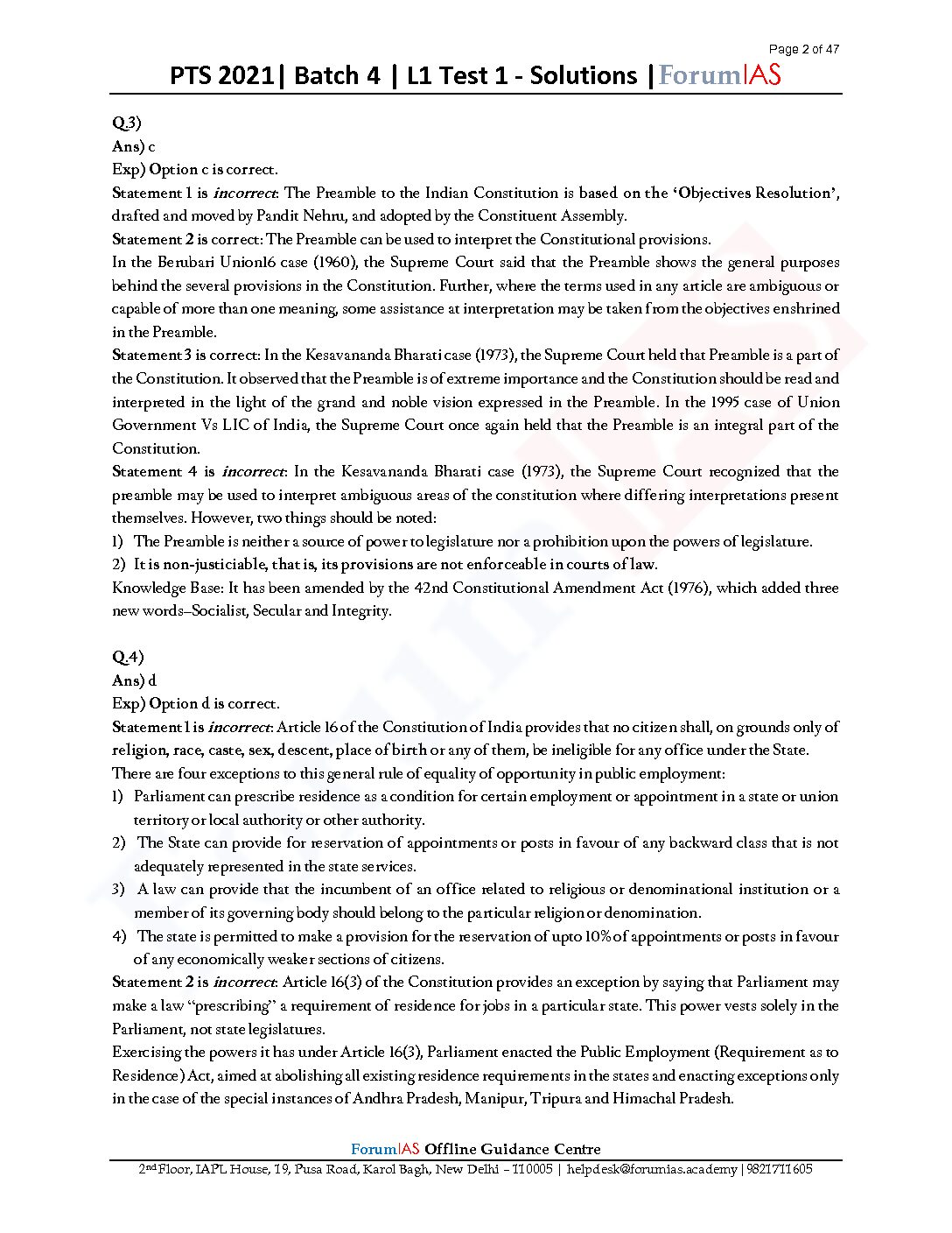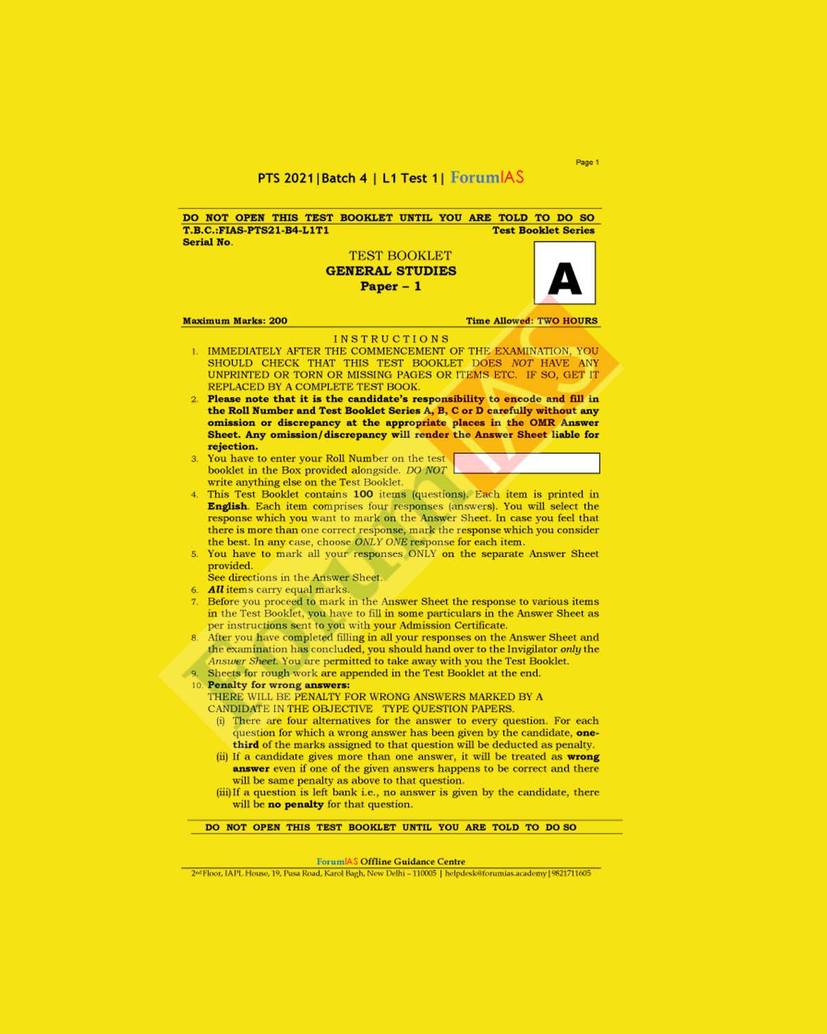 / FORUMIAS TEST BOOKLET GENERAL STUDIES PAPER – I BATCH – 4 – L1 TEST-1 PTS 2021