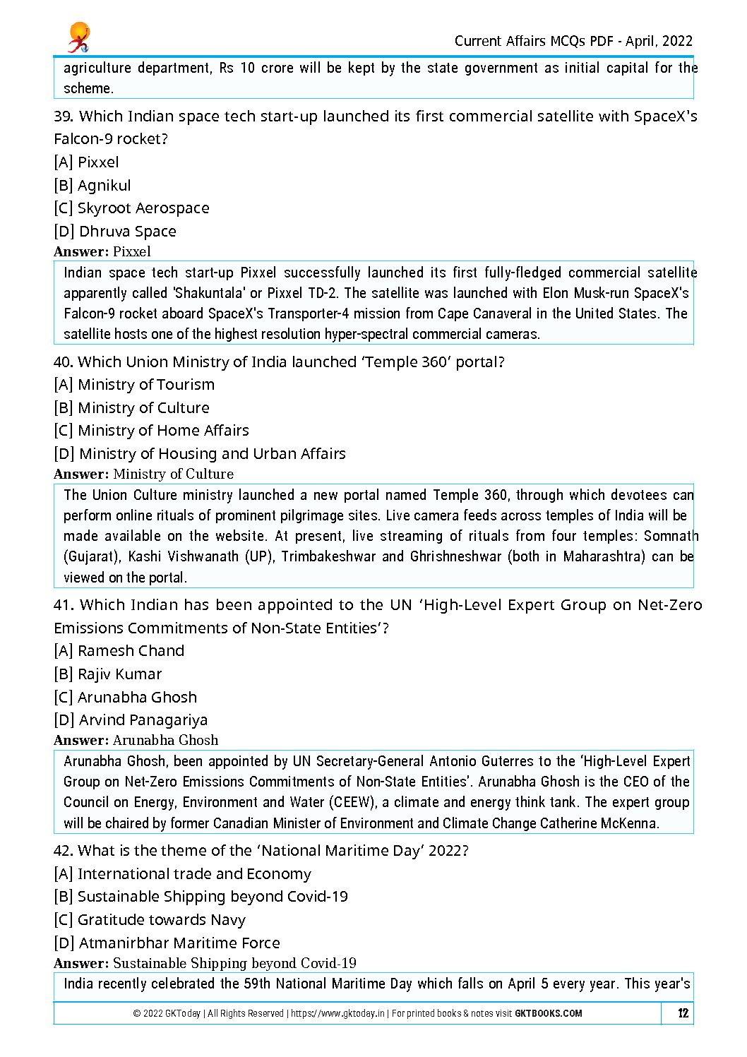 / GKTODAY CURRENT AFFAIR QUIZ APRIL 2022 (BLACK & WHITE)