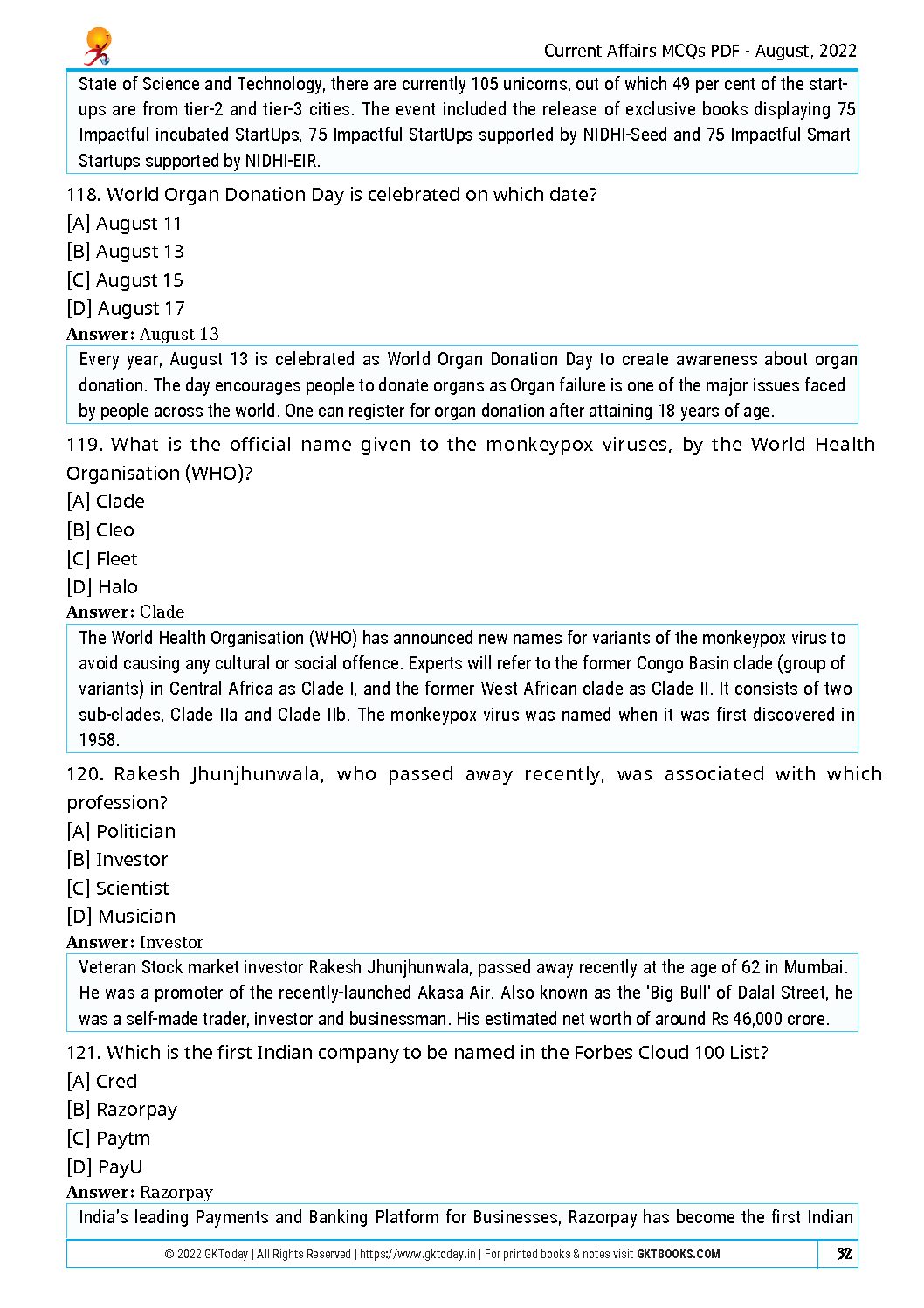 / GKTODAY QUIZ AUGUST- 2022 CURRENT AFFAIRS MCQ PDF (BLACK & WHITE)