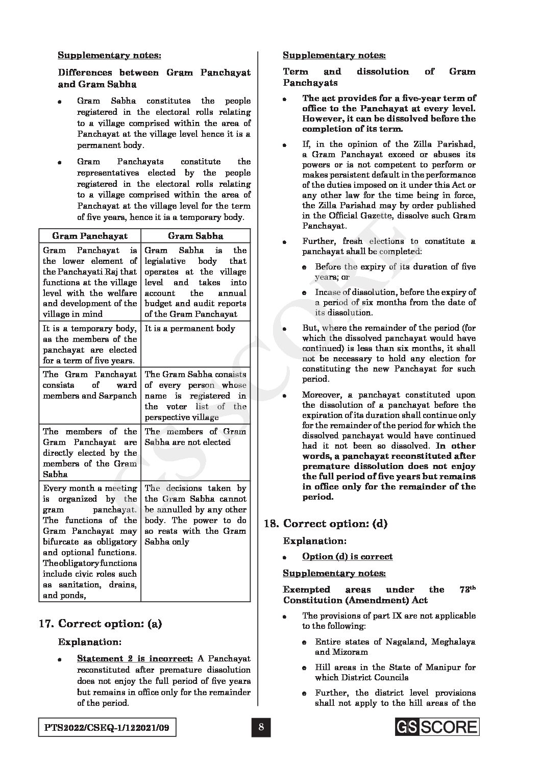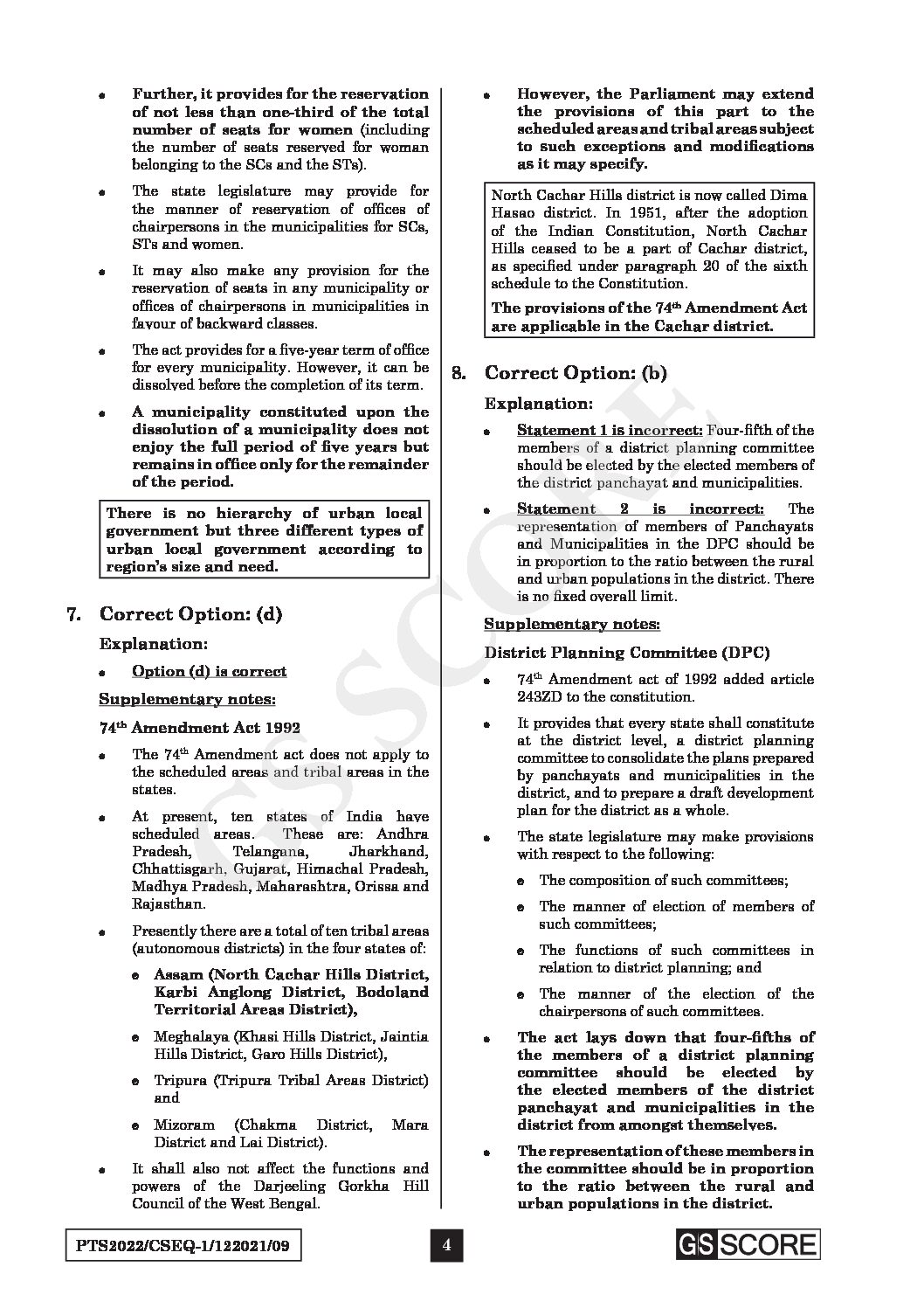 GS SCORE 2022 PRELIMS QUALIFIER REVISION DAILY TEST TEST-09 POLITY- LOCAL GOVERNMENT UNION TERRITORIES & SPECIAL ARIEAS (BLACK & WHITE)