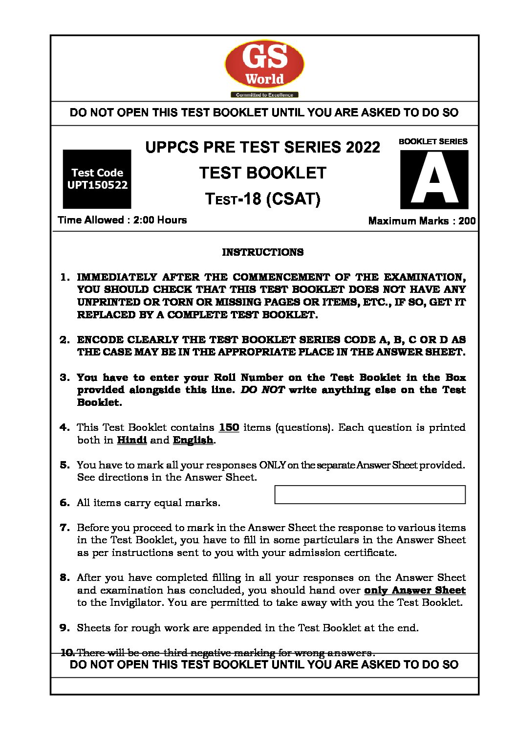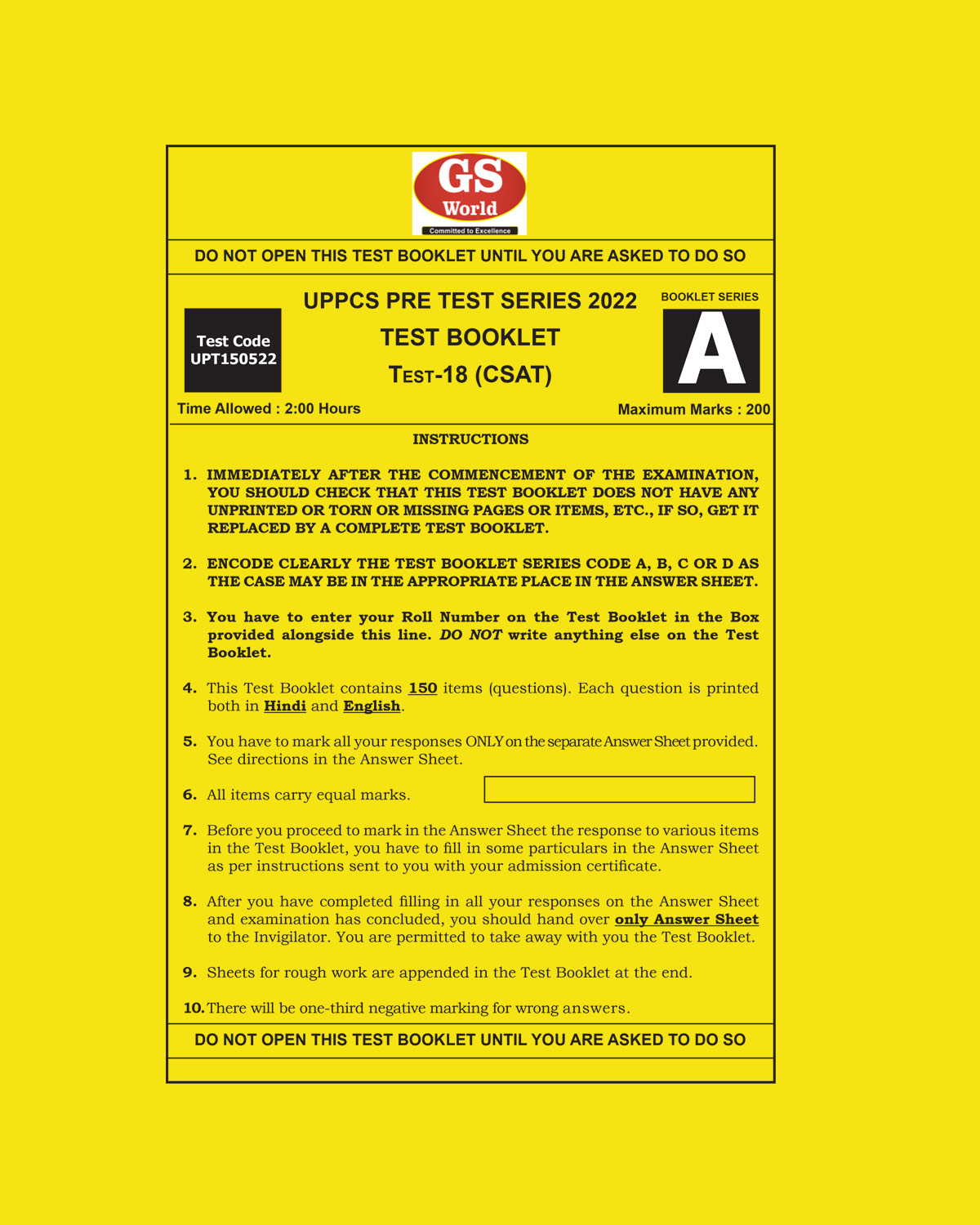 / GS WORLD 2022 TEST-18 UPPCS PRE TEST SERIES (CSAT TEST-3 ) 2022 (BLACK & WHITE)