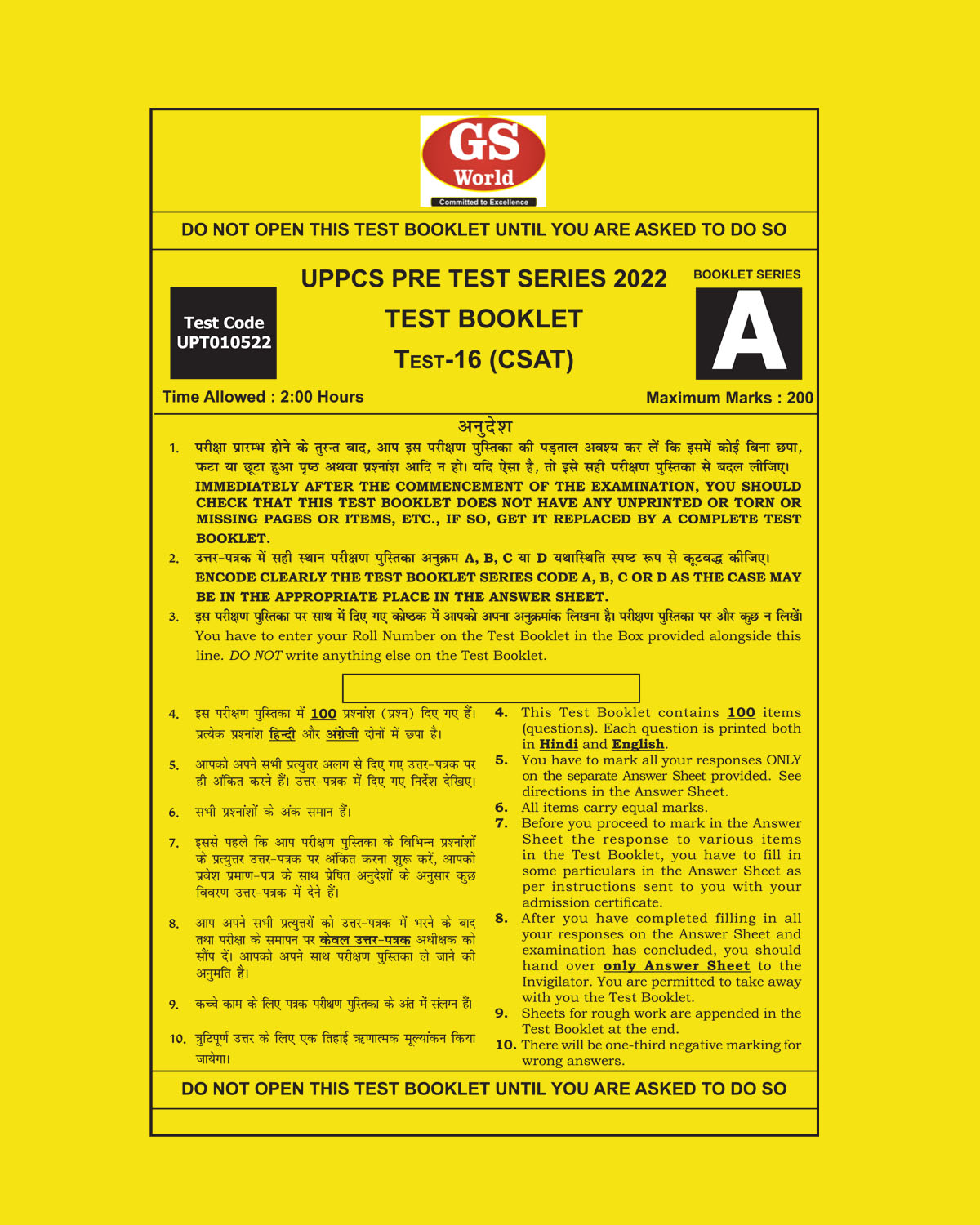 GS WORLD TEST-16-(CSAT TEST-2 ) 2022 (BLACK & WHITE)