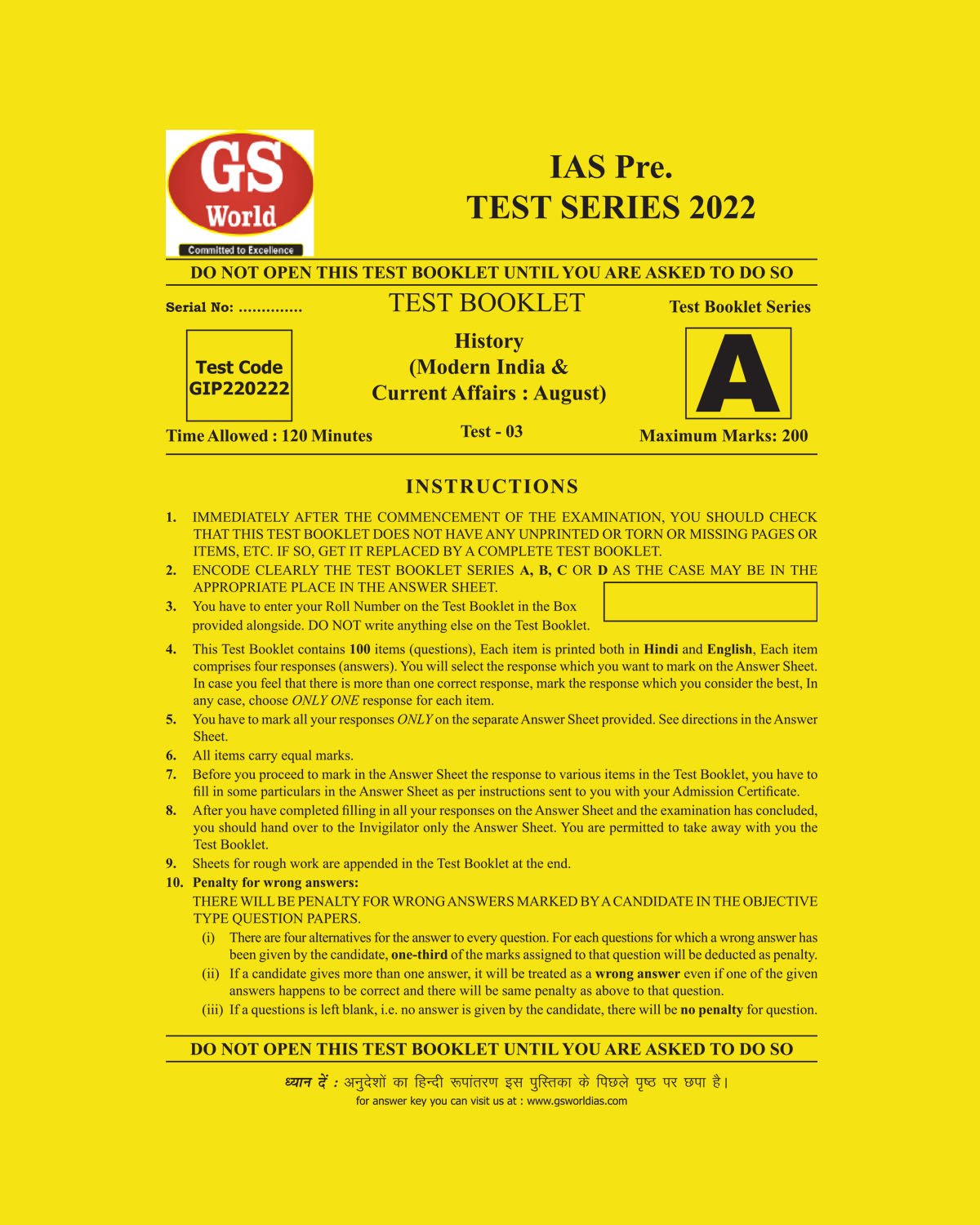 GS WORLD TEST-3 (MODERN INDIA & CURRENT AFFAIRS AUGUST) 2022 (BLACK & WHITE) quantity