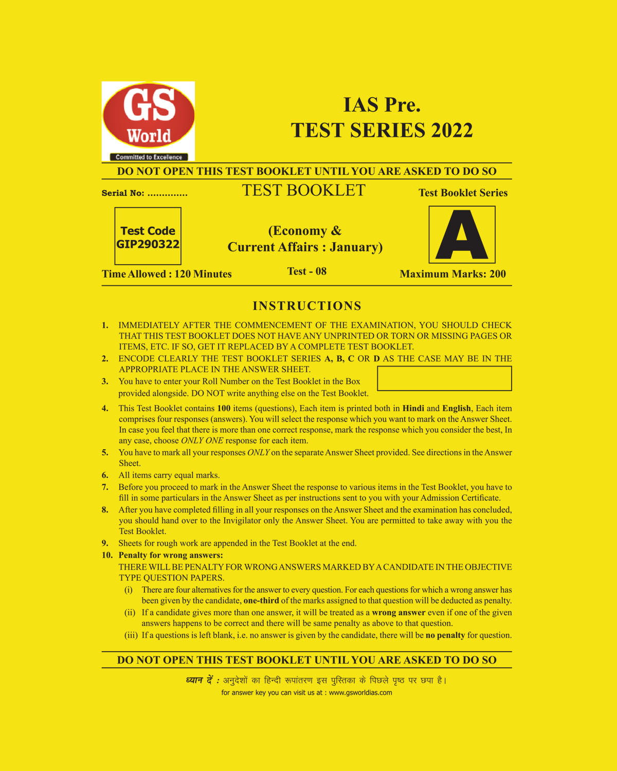 GS WORLD TEST-8-(ECONOMY & CURRENT AFFAIRS JANUARY) 2022 (BLACK & WHITE) quantity