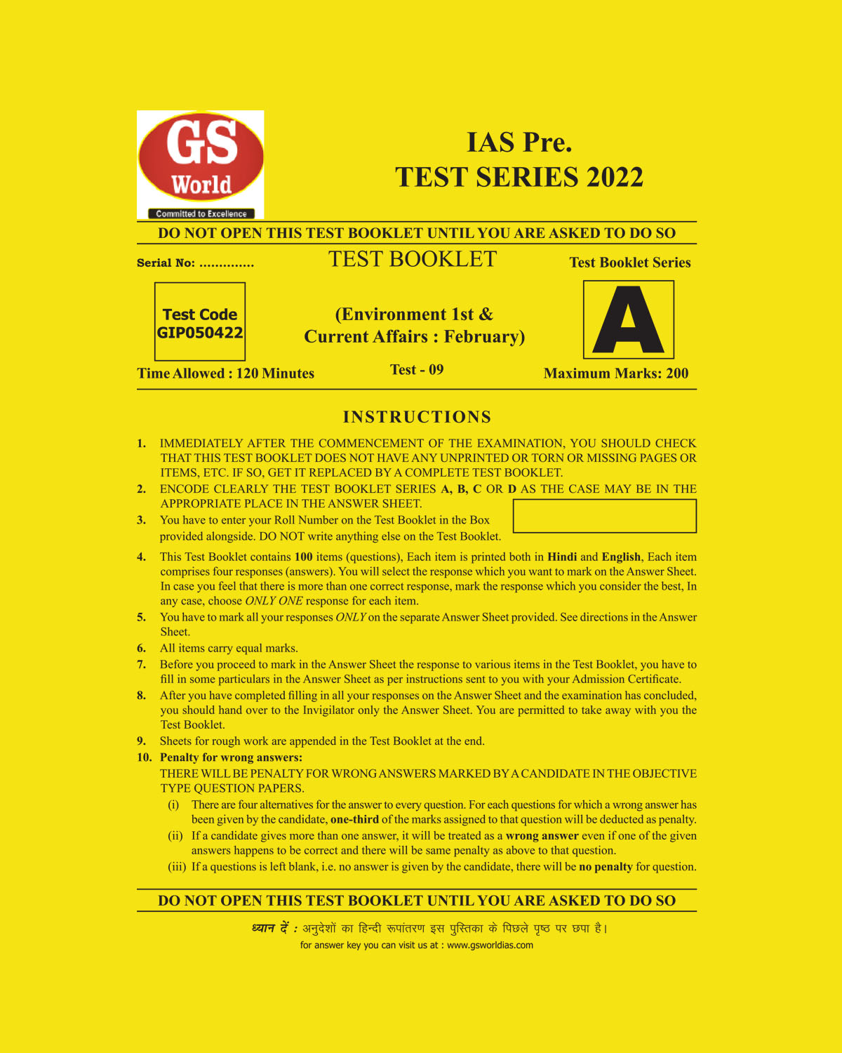 GS WORLD TEST-9-(ENVIRONMENT 1ST & CURRENT AFFAIRS FEBRUARY) 2022 (BLACK & WHITE) quantity