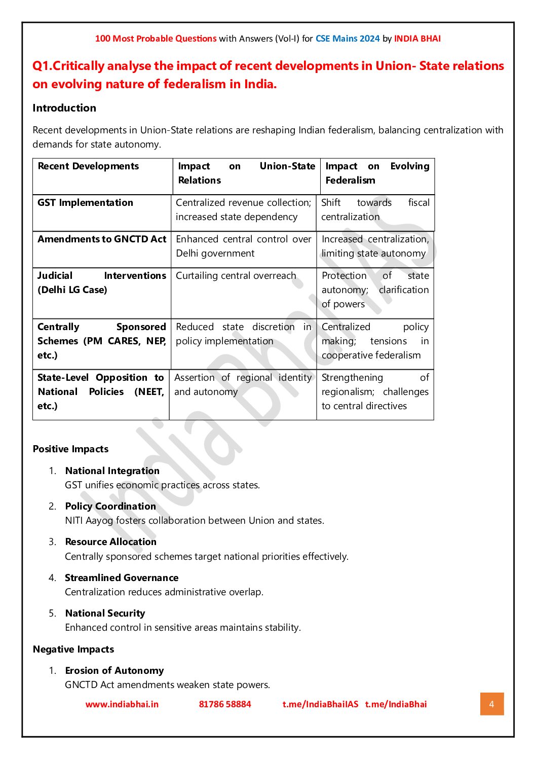 INDIA BHAI 2024 100 MOST PROBABLE MAINS PART-1 2024 FINAL (ENGLISH) {BLACK AND WHITE}