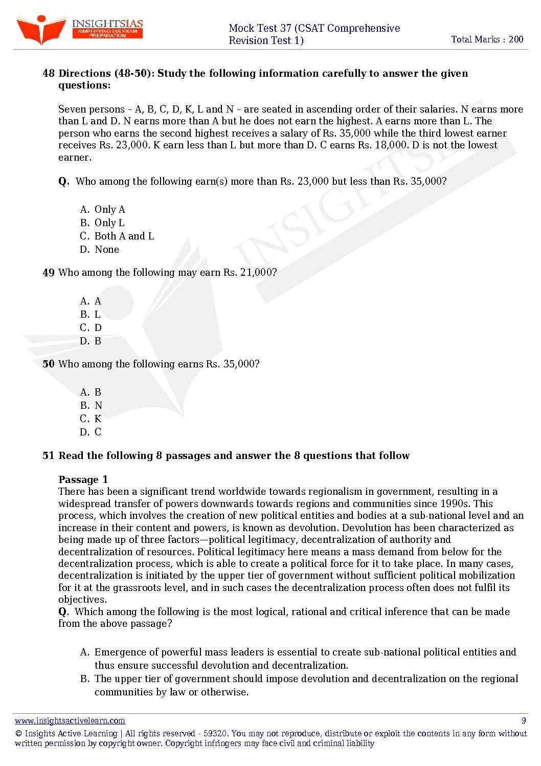 INISGHTS ONINDIA PT TEST-37 ( CSAT COMPREHENSIVE REVISION TEST-1) 2019 quantity