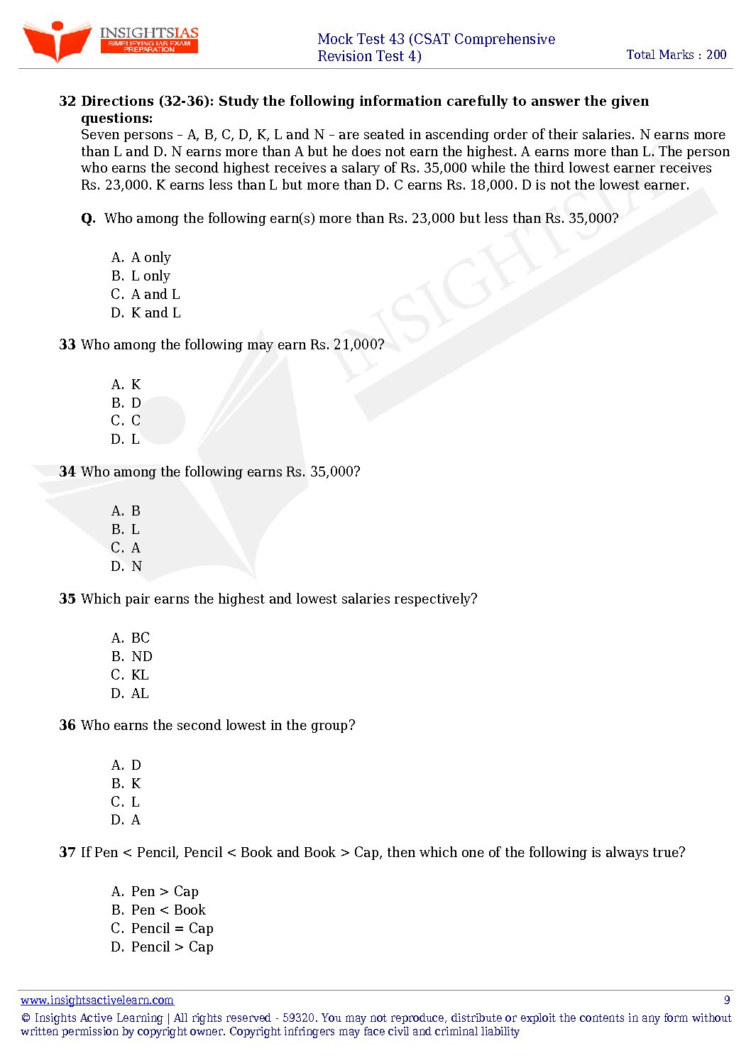 INISGHTS ONINDIA PT TEST-43 ( CSAT COMPREHENSIVE REVISION TEST-4) 2019 quantity