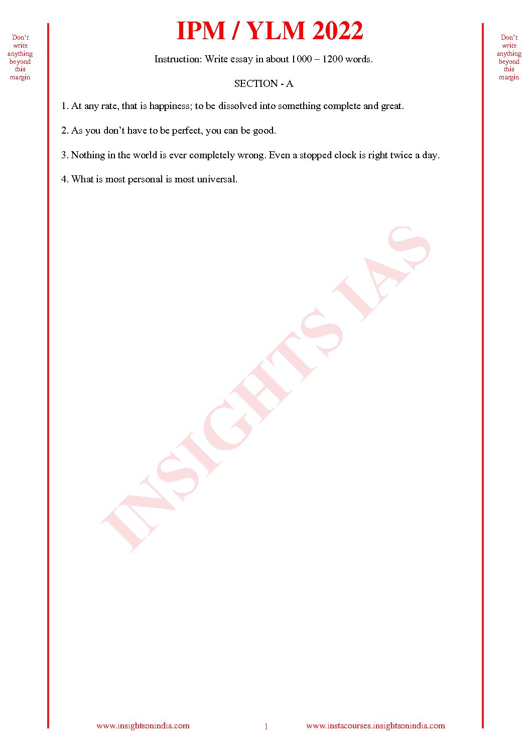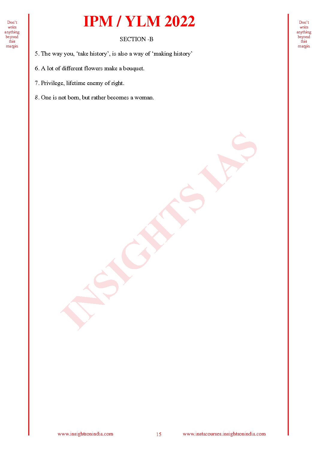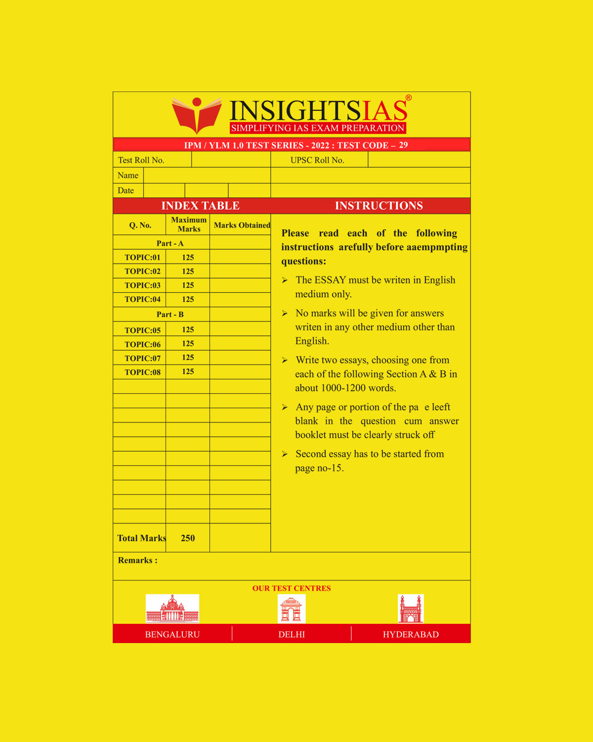 / INSIGHTS IAS INSIGHTS ONINDIA 2022 QCA (QUESTION CUM ANSWER BOOKLET) TEST-29 (BLACK & WHITE)