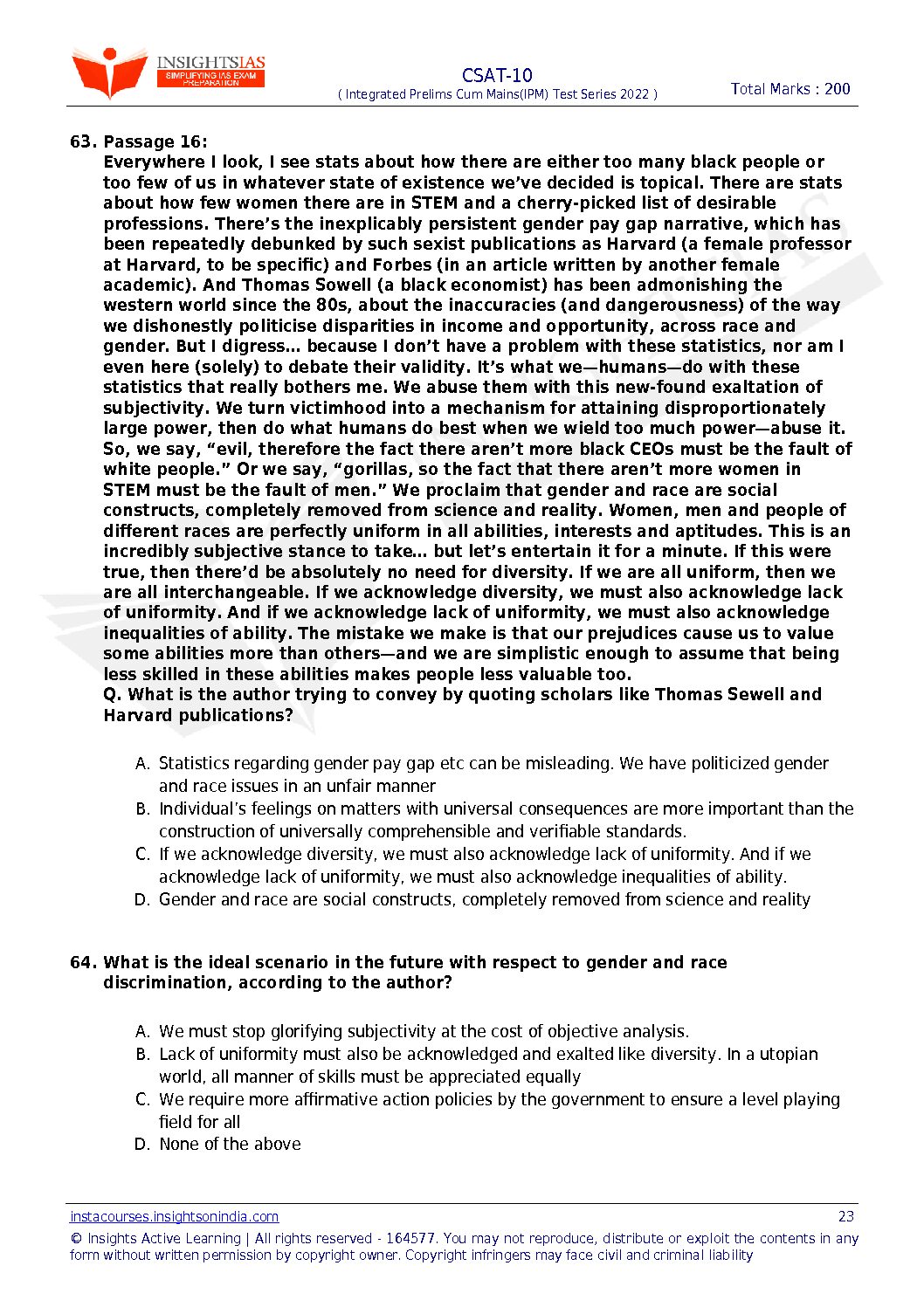 INSIGHTS ONINDIA 2022 PT TEST-10 WITH SOLUTION (CSAT-10) (SUBJECTWISE APPROACH) 2022 (BLACK & WHITE)