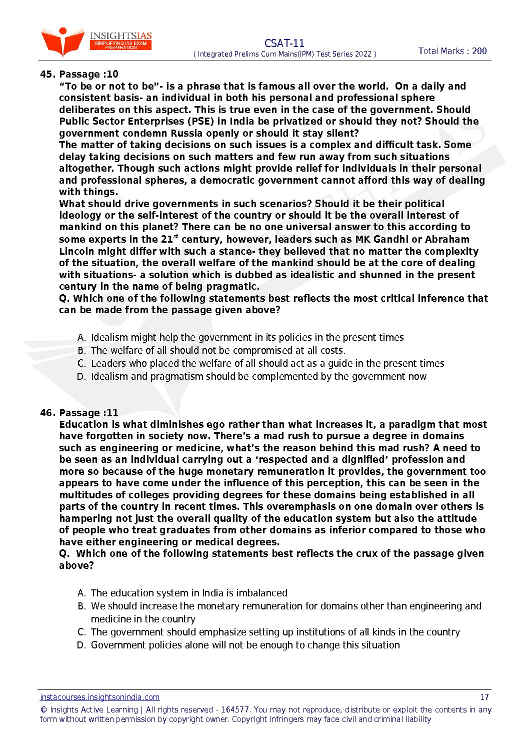 INSIGHTS ONINDIA 2022 PT TEST-11 WITH SOLUTION (CSAT-11) (SUBJECTWISE APPROACH) 2022 (BLACK & WHITE)