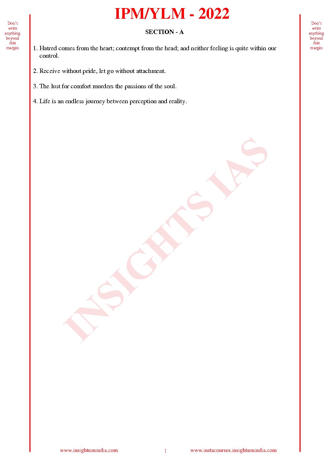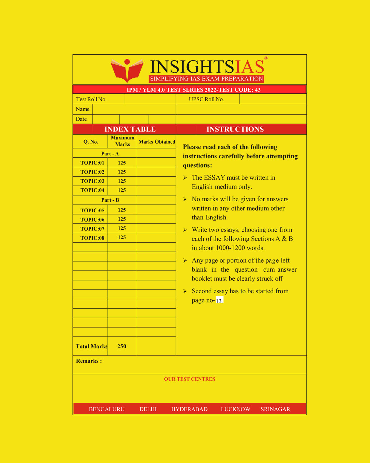 INSIGHTS ONINDIA 2022 QCA TEST-43 QCA (QUESTION CUM ANSWER BOOKLET) (BLACK & WHITE)